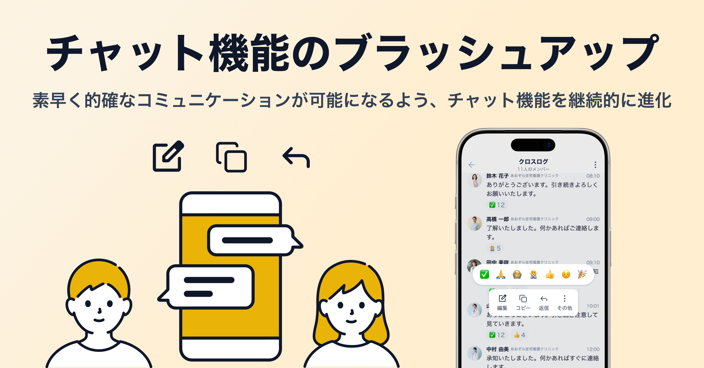 メンション機能や特定メッセージへの返信機能を追加するなど、グループチャットでも情報が錯綜せず、素早く的確なコミュニケーションが可能になるよう、チャット機能を継続的に進化させています。今後もUI/UXを含めた細かなアップデートを行い、現場での使いやすさを高めていきます。