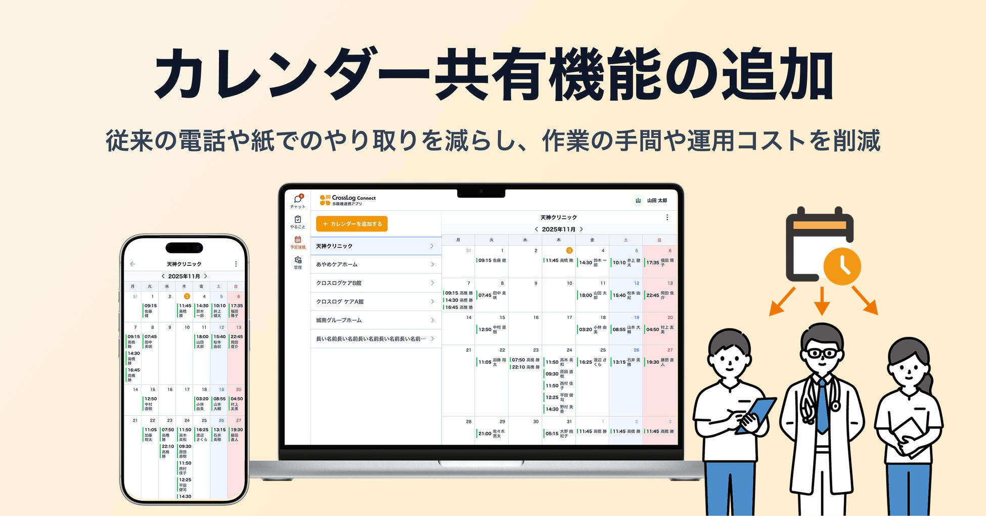 クロスログのスケジュールや患者情報と連携。登録作業や連絡の手間を大幅に軽減。
