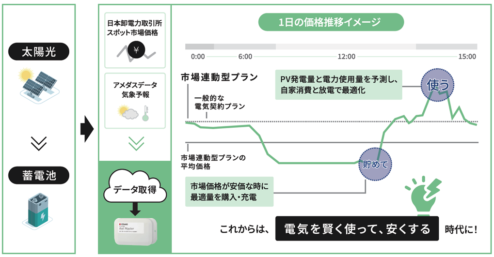 エッジAI制御により、電力会社が提供する「市場連動型プラン」で安価な電力を購入。市場価格が高騰する時間帯の電力調達を抑えます。
