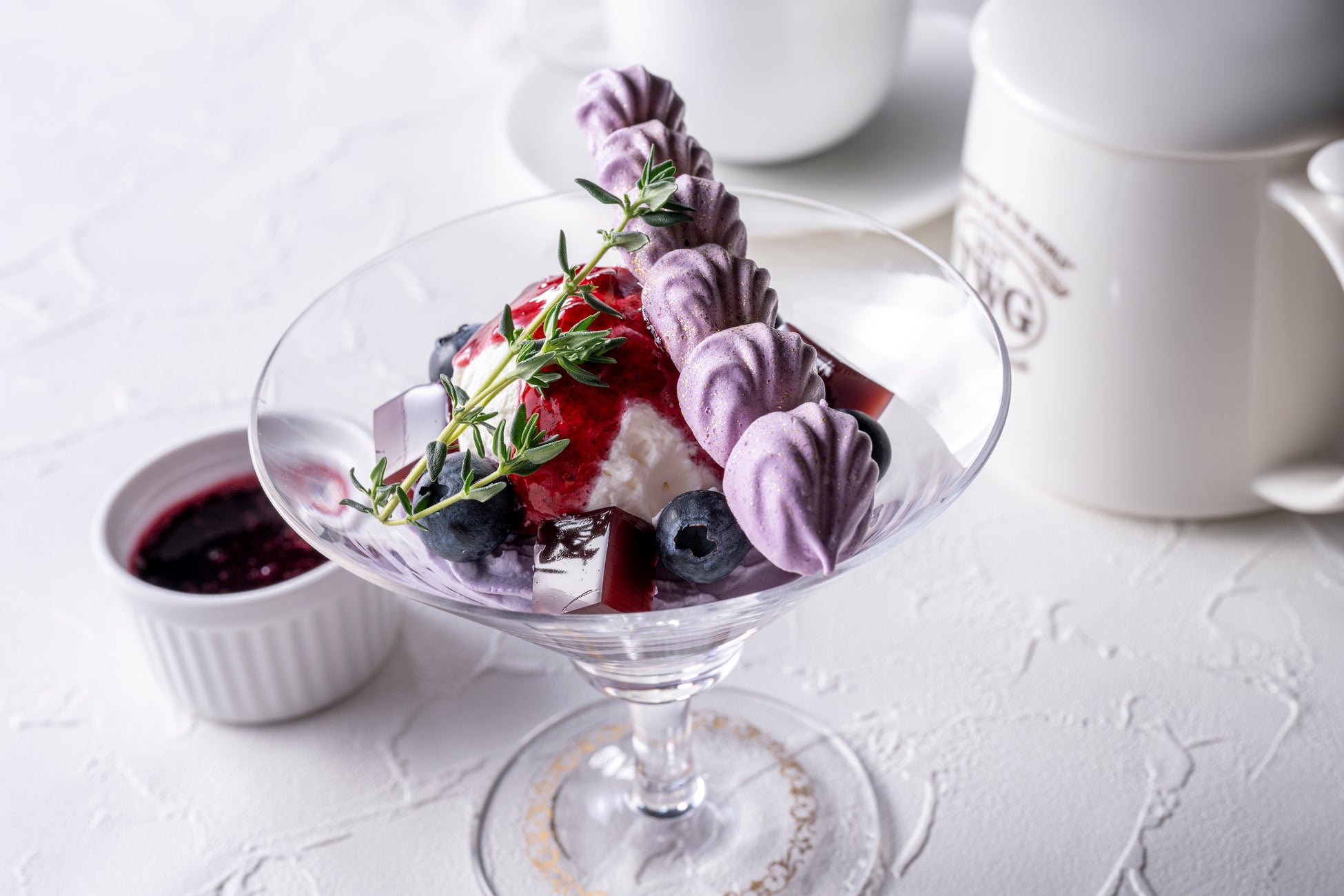 メインには、高貴な貴婦人を思わせる佇まいのブルーベリーのパフェが登場します。サワークリームのアイスクリームを中心に、ぶどうのジュレ、フレッシュなブルーベリーをあしらい、果実の酸味と香り、サクサクとした食感が楽しめる上品な色合いのカシスメレンゲを添えました。別添えのブルーベリーソースをかけると、よりさっぱりと味わっていただけます。最後に現れるラベンダーのジュレには、香りで初夏の爽やかな季節を感じていただきたいというシェフの想いがこもっています。