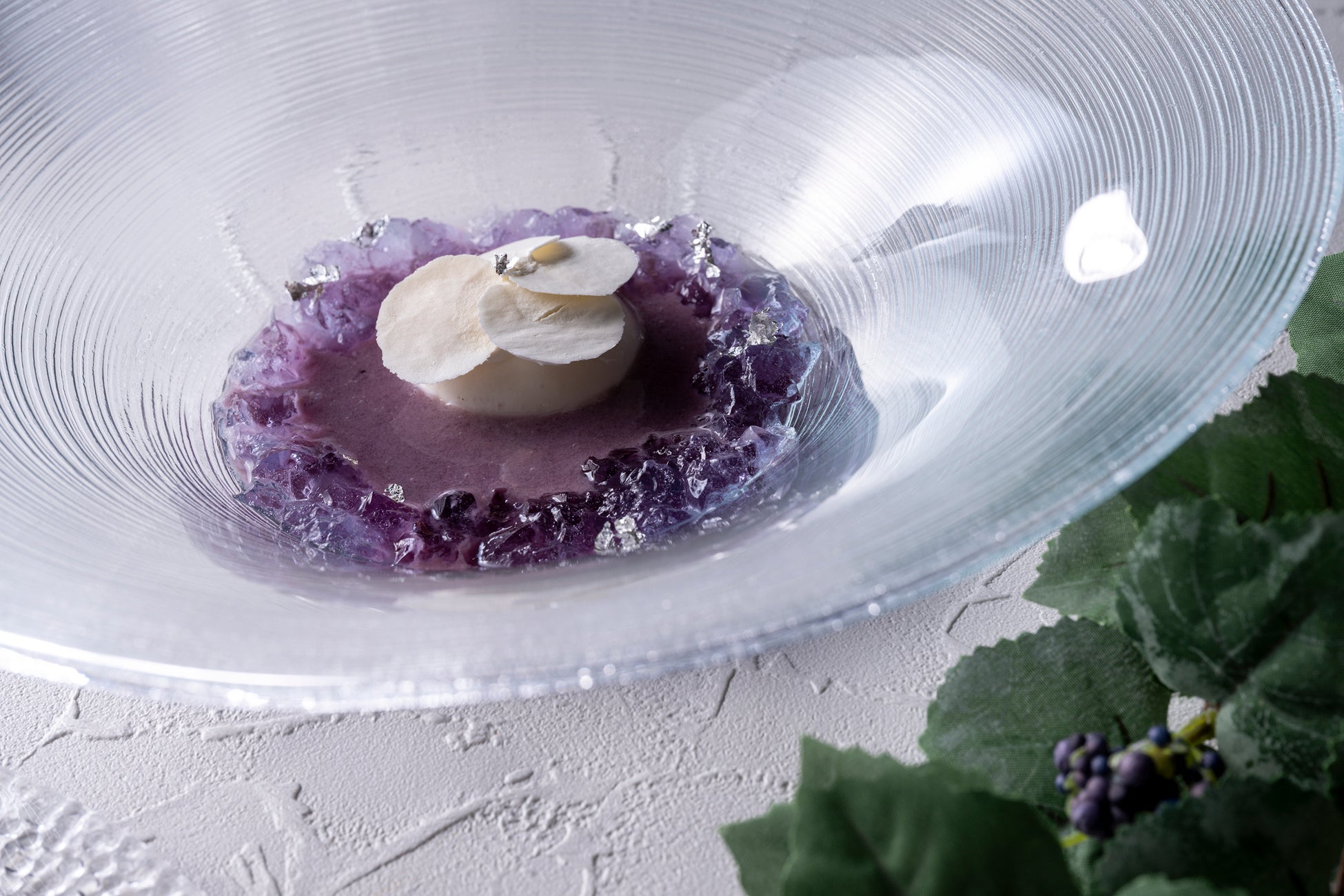 スープには、スミレ色が美しい巨峰とヨーグルトの冷たいスープに、チーズムースと宝石のようなジュレを合わせました。口のなかで溶けるメレンゲでできた花びらの儚い食感と、ヨーグルトの爽やかな酸味、口のなかでそっと溶けるジュレのマリアージュが味わえる一品です。