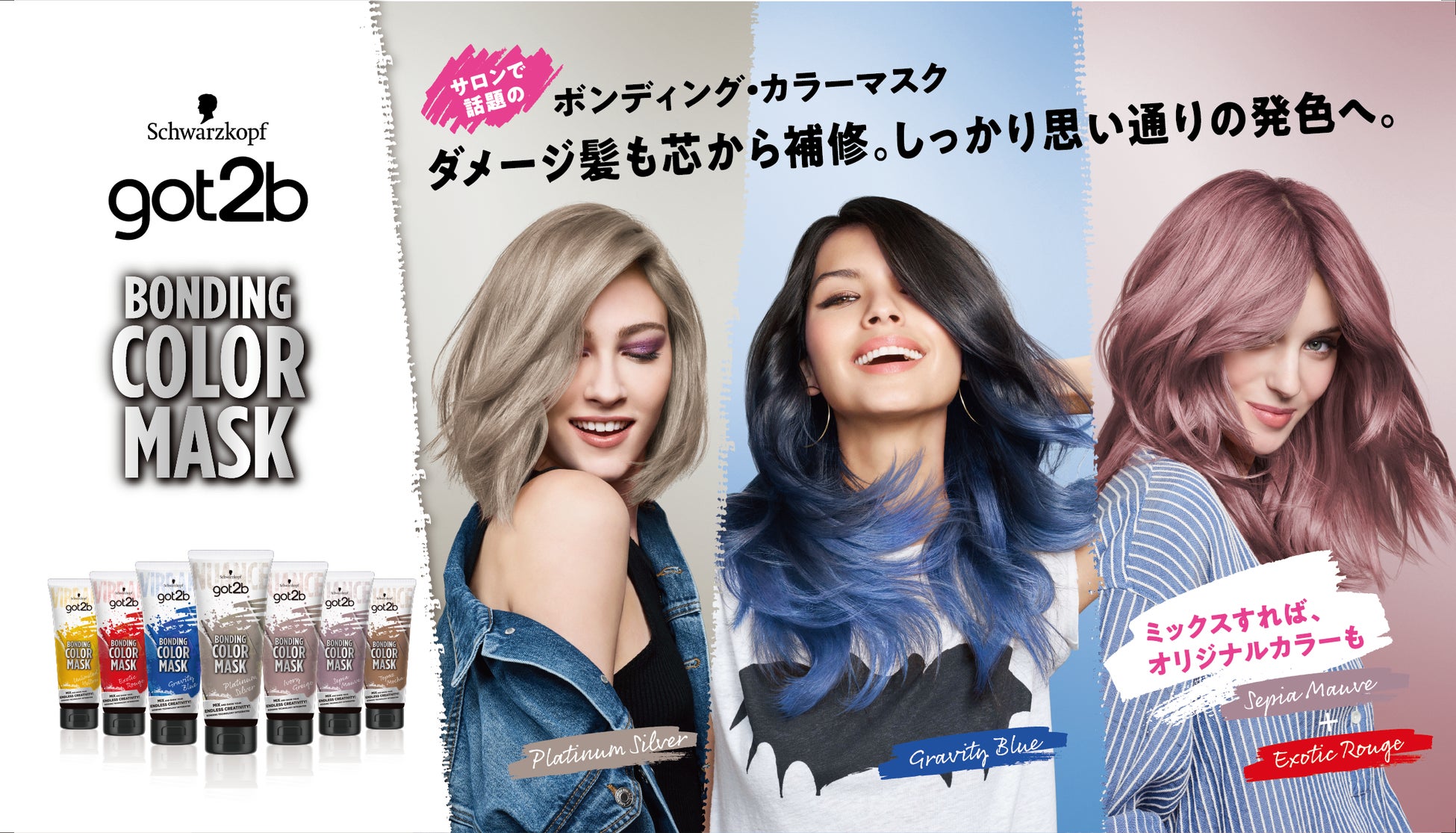 ヘアカラーにおいて約2人に1人が抱える一番の不満は「髪のダメージ」。(*2) got2b ボンディング・カラーマスクはサロンで話題の「ボンディング・テクノロジー」搭載、ブリーチ後の髪をケアしながら、幅広いカラーラインアップで好きなカラーに染めるのはもちろん自分だけのオリジナルカラーを楽しめます。
