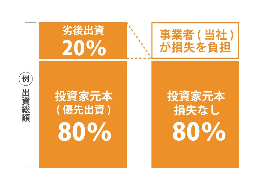 本ファンドは、出資総額の20%(680万円)まで事業者が優先的に損失を負担することで出資者の元本の保全を図ります。