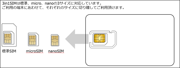 ご利用いただく端末に応じて、「標準SIM」、「microSIM」、「nanoSIM」のいずれかのサイズに利用者自ら切り外してご利用いただけるSIMカードです。SIMカードを一度台紙から切り外しても、同梱のアダプタにはめ込むことで、他のサイズに変形させてご利用いただけます。3種類のSIMを自由に利用できるため、申込時にSIMのサイズを意識する必要がなくなります。
