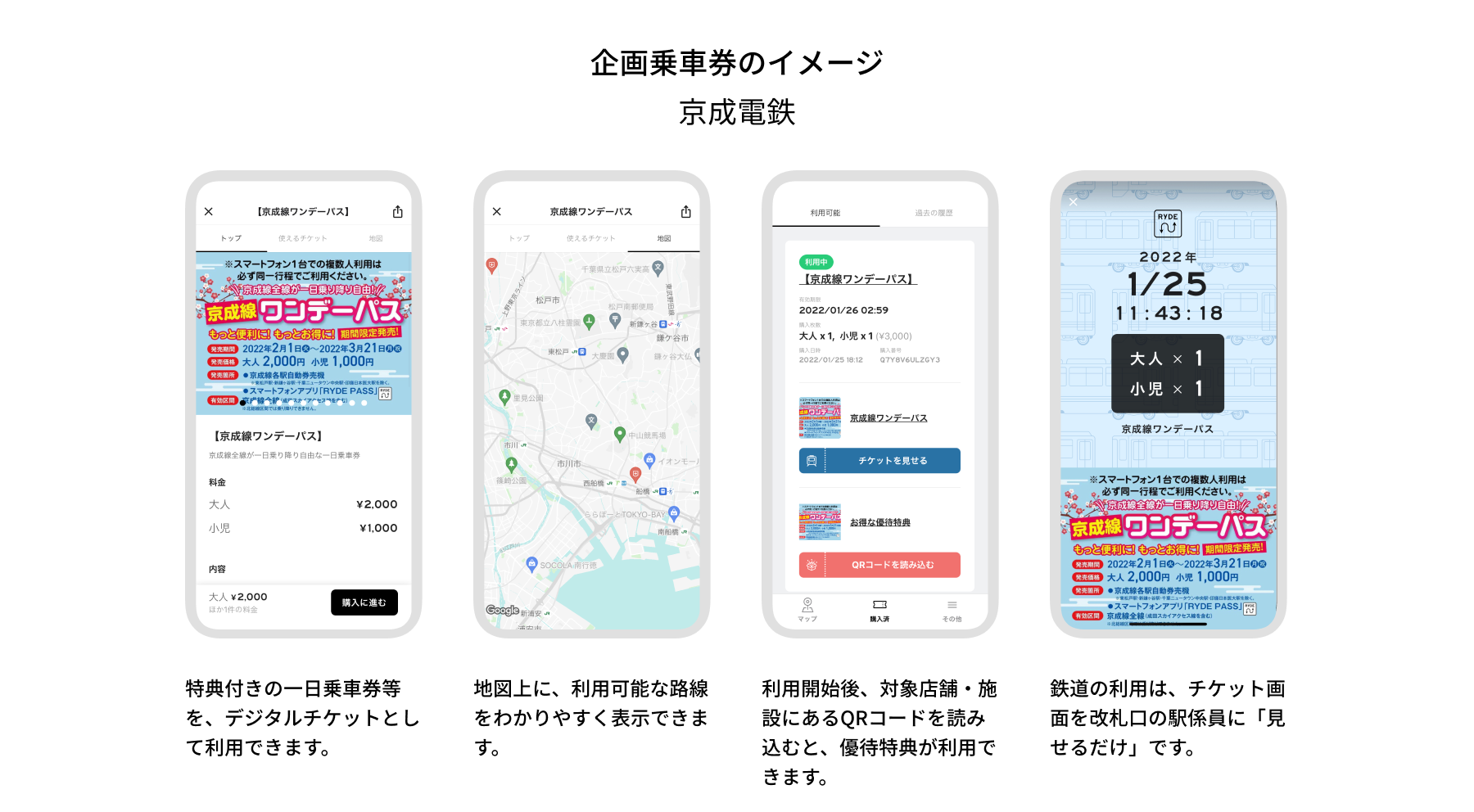 「京成線ワンデーパス」は京成電鉄が期間限定で発売する全線一日乗車券で、成田スカイアクセス線を含む京成線全線が一日乗り降り自由となります※。さらに、ご利用当日に提携の対象店舗・施設で様々な優待特典が受けられます。「RYDE PASS」上ではクレジットカード等での事前決済が可能となっており、スマートフォン1つで鉄道や優待特典が利用できるため、快適でおトクな旅をお楽しみいただけます。
