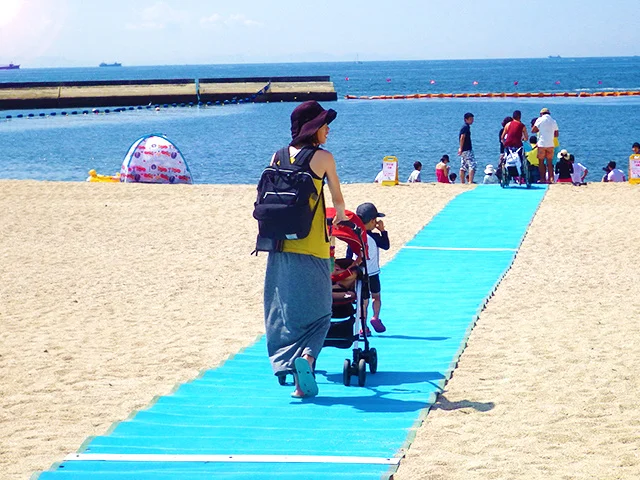 *これらの『海遊び』を誰でも楽しんでいただけるよう、当日は須磨ユニバーサルビーチプロジェクトによるビーチマットも設置。車イスの方やベビーカーの方々も砂浜で楽しんでいただけます。