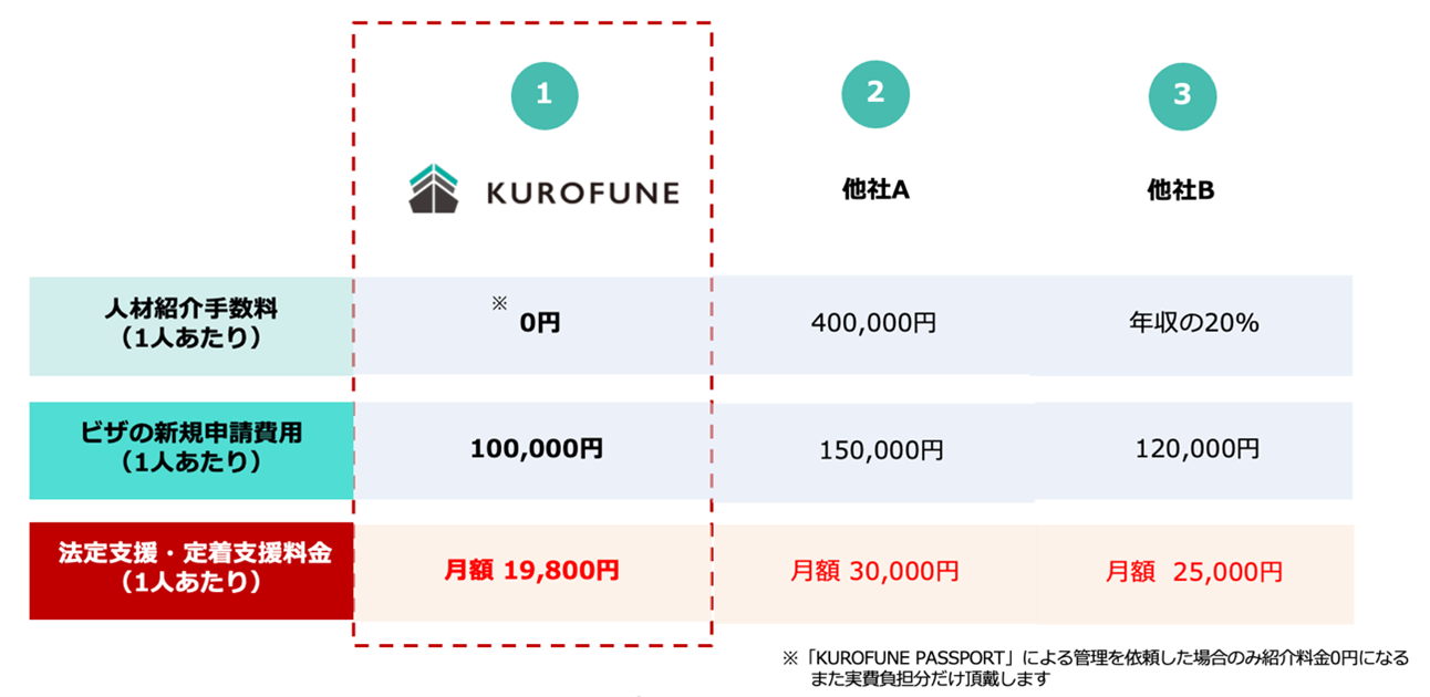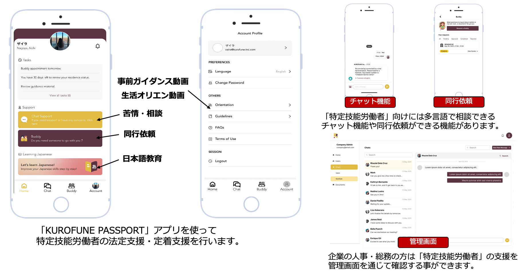 「特定技能」の労働者の法定支援・定着支援アプリ「KUROFUNE PASSPORT」アプリを自社開発し、「人材紹介」ではなく、「定着支援」に重点を置いたサービスです。人材紹介業界では考えられなかった人材紹介料0円でサービスを提供しています。