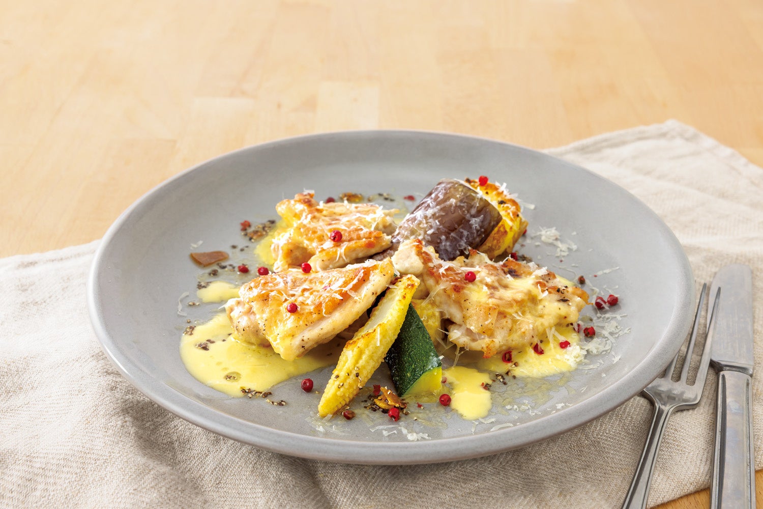 ハモンセラーノとチーズを重ねたカツレツに、ゴルゴンゾーラの香り豊かなクリーミーソースを添えた贅沢な一皿。ピンクペッパーの爽やかな風味がアクセントとなり、全体の味わいを引き締めます。