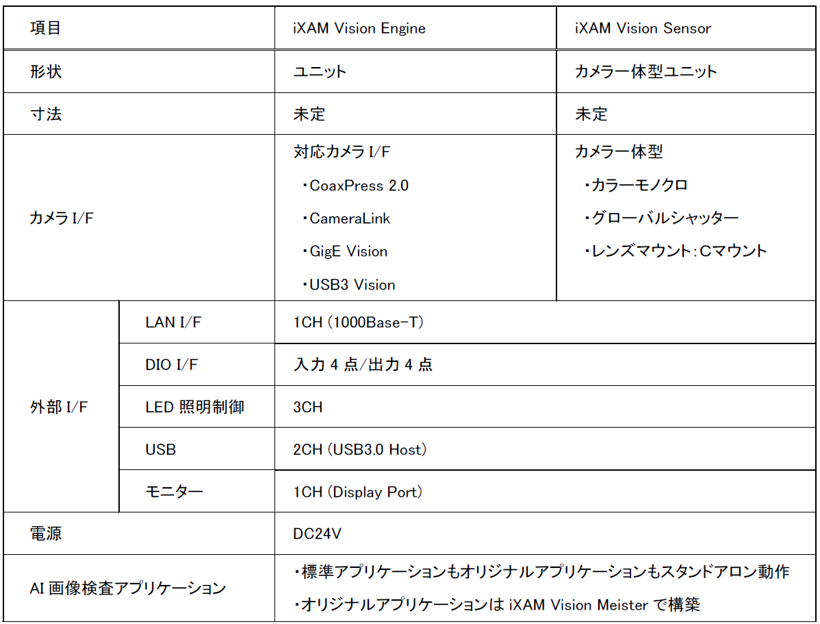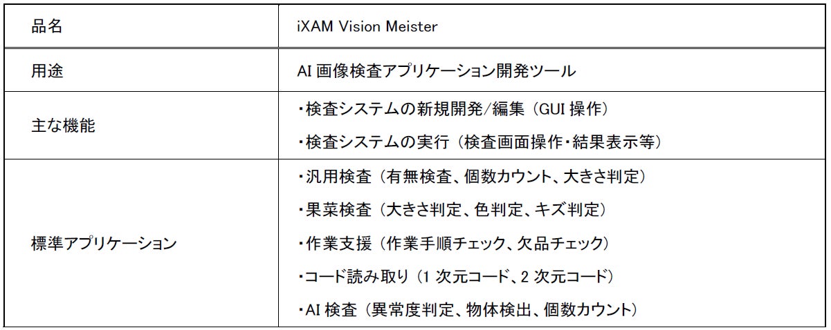 「iXAM Vision Sensor」は、従来シリーズ(*1)にはない、AI・画像処理・カメラ・照明・レンズが一体となったインテリジェントカメラタイプです。撮像から判定・検査までユニット内で動作するため、省スペースでAI画像検査を導入できます。また、ユーザビリティを向上させたAI画像検査アプリケーション開発ツールもラインアップしています。