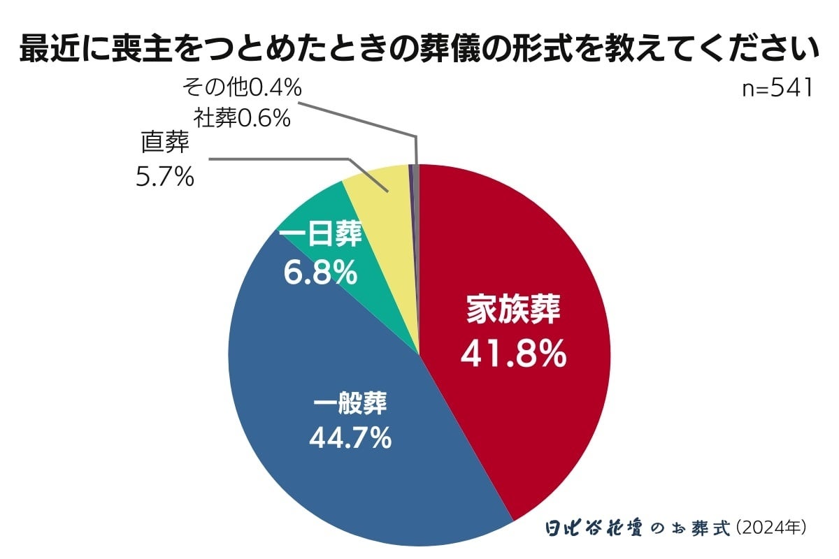 2024年に実施した「日比谷花壇のお葬式」のアンケート調査によると、家族葬・一日葬を選択する人は全体の約49%となり、近年、葬儀を家族のみで執り行うケースが増加傾向にあります。また、当社サービスをご利用いただくお客様の約67%が葬儀の装花においてカタログの定型デザインから花材を変更するなど、オリジナルの花装飾で故人を見送られており、故人に伝えきれなかった想いを花に託したい人が多くいることがうかがえます。