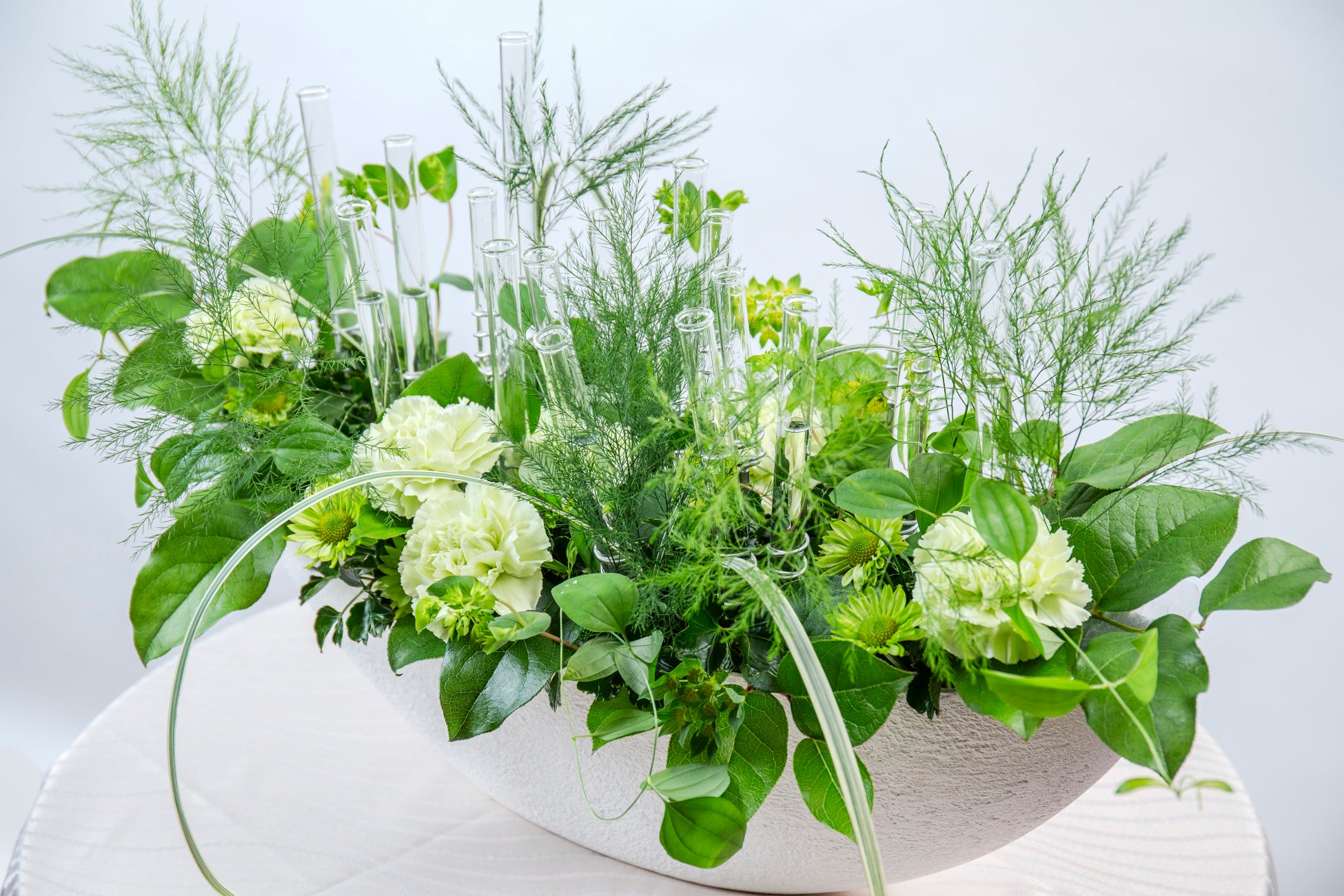 『みんなでつくるおそなえアレンジメントキット』は、フローリストがデザインした葉物やグリーンの花々によるベースと複数の小さな花瓶があらかじめセットされた花器に、お客様ご自身でお好みの花材を挿し、故人へのお供えのアレンジメントを完成させる参加型の商品です。花瓶に花を挿すだけのため、お子さまでも簡単にご参加いただけます。家族葬・一日葬のリラックスした雰囲気のなか行う花体験が、故人との最後の家族時間をかげがえのない思い出にしてくれます。