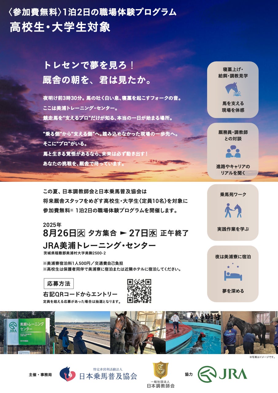 日本乗馬普及協会は、「乗馬普及による引退競走馬のセカンドキャリア創出」「馬産業を支える人材育成」をミッションとして活動しています。本プログラムは、競走馬を支える仕事に早期から触れる機会を提供し、業界の人材不足解消と若者のキャリア形成支援を目的に企画しました。