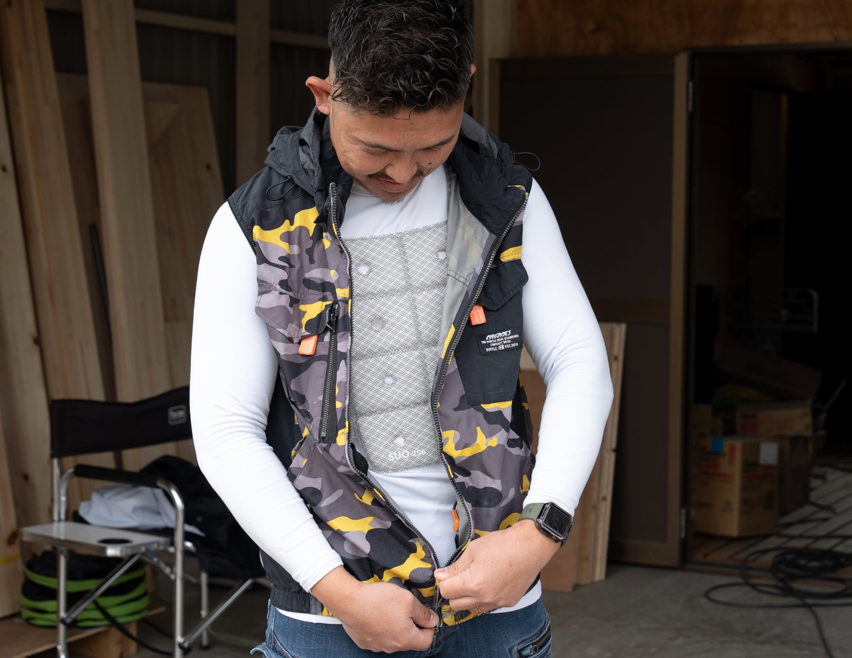 また、既存のファン付き作業服と組み合わせることで、さらなる冷却効果を発揮します。ファン付き作業服はファンで外気を取り込む構造であることから外気温が冷却の限界でしたが、「SUO256・18°ICE チョッキ」を装着することで作業服内の空気をさらに冷やすことができます。この相乗効果により、極端な暑さの中でも快適に作業を続けることができます。