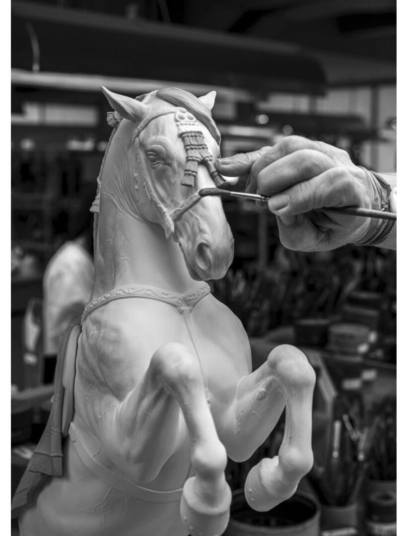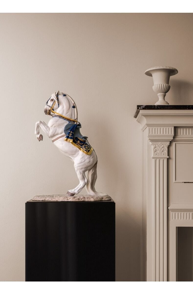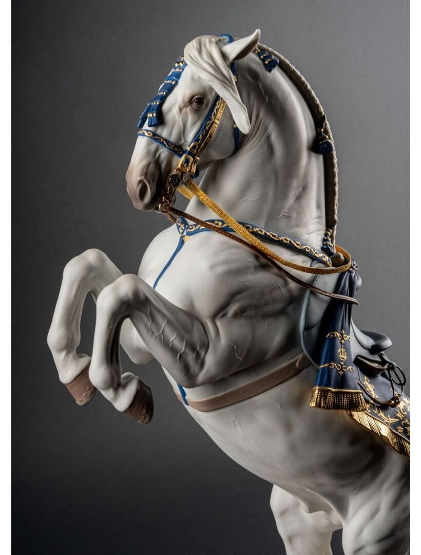 スペインのヘレスにある王立アンダルシア馬術学校の馬をモチーフにした、世界限定制作数500個のハイポーセリン作品です。スペイン純血種は、世界で最も権威のある名馬の品種であり、この美しい馬がオートエコール・ドレッサージュの古典的な動作のひとつであるコルベットを優雅にこなし、デモンストレーションを披露している様を、解剖学的にも正確さをもって忠実に再現しました。