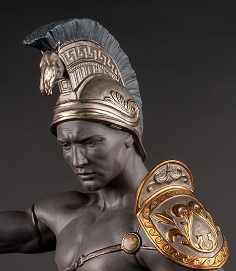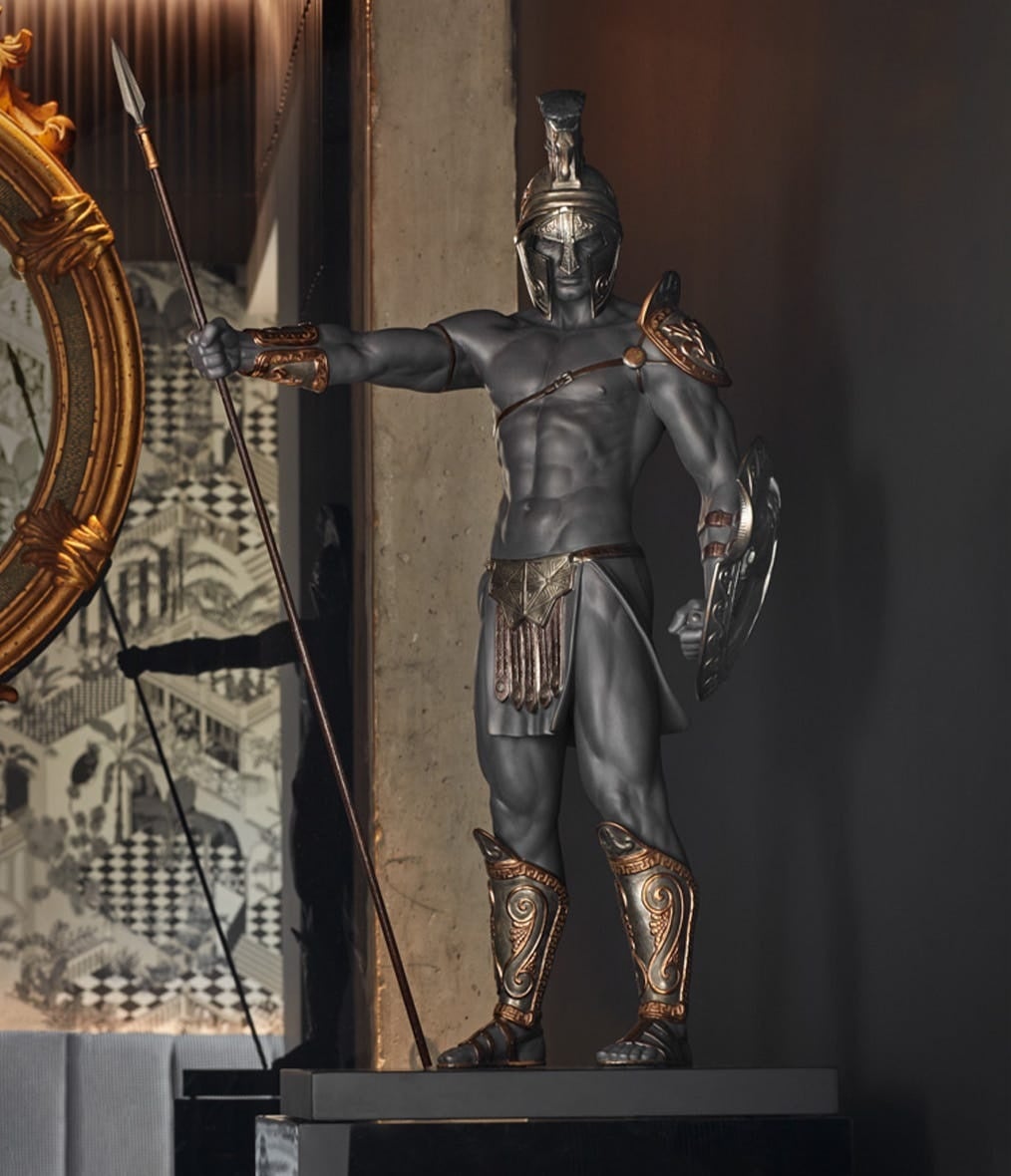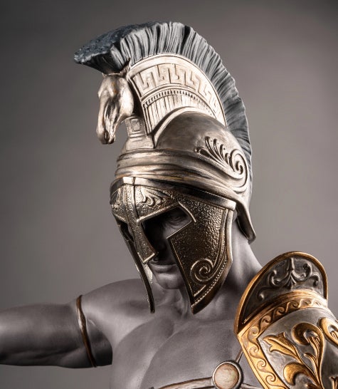 古代ギリシャ「テルモピュライの戦い」で、その勇気と犠牲が永遠の伝説となった勇敢な兵士の姿は、今日微細なディテールや華やかな装飾を施した力強い黒磁の彫刻「スパルタン」となり登場。羽のついた華やかなヘルメット、マグネットによって脱着可能なマスク、槍や盾、装飾を施したプロテクターなど、戦いの装備すべてを身に纏っています。