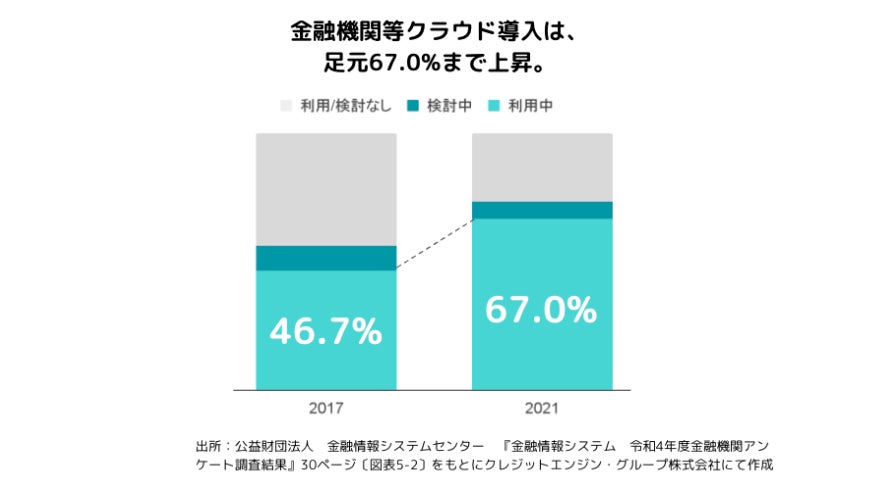 国内の融資・債権回収業務のデジタル化の市場の規模は、いずれも年間数兆円を超える巨大市場です。足元、金融機関等のクラウド導入は67%まで上昇しており(出所:公益財団法人 金融情報システムセンター 「金融情報システム 令和4年度金融機関アンケート調査結果」30ページ〔図表5-2〕、※図1)、加えて、新規プレーヤーの金融事業の参入も相次ぎ、融資・債権回収に関して特定のシステムの汎用パッケージを導入する流れが加速しています。他方で、融資・債権回収業務の汎用パッケージの開発を行うにあたっては、各種規制への対応、高いセキュリティ要件、複雑な既存システムとの接続など、金融機関の要求を満たしたシステムの提供が求められています。