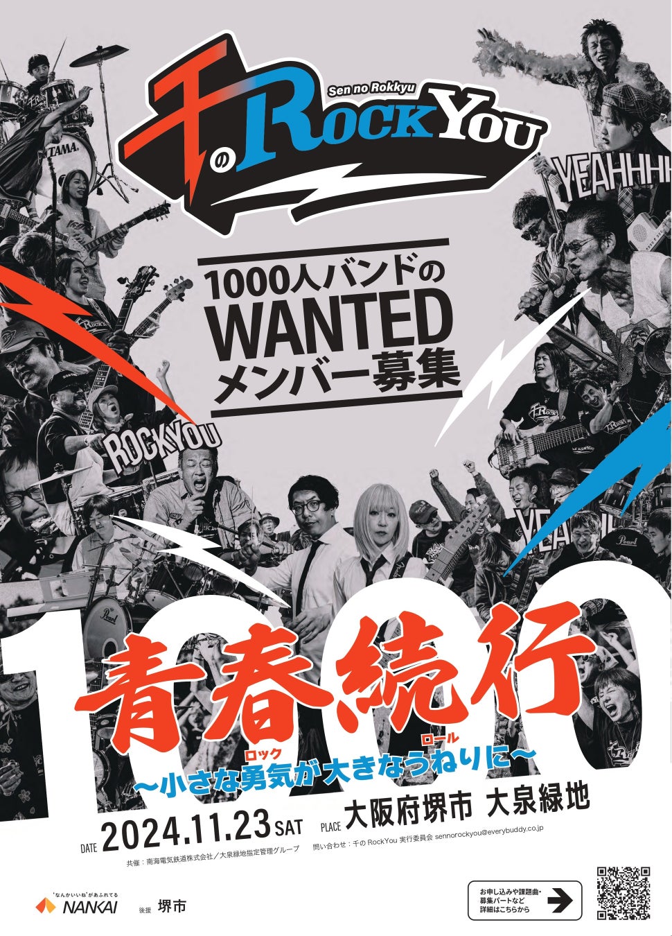南海電気鉄道株式会社(社長:岡嶋 信行)では、ボーカル、ギター、ベース、キーボード、ドラムのバンドメンバーを合計1,000人募集し、大泉緑地・大芝生広場(堺市北区金岡町128)にて、同時演奏を行うイベント 「千のRockYou!!2024」(センノロッキュー)を、11月23日(土・祝)に開催します。各パートのバンドメンバー募集を7月30日(火)13時から開始します。