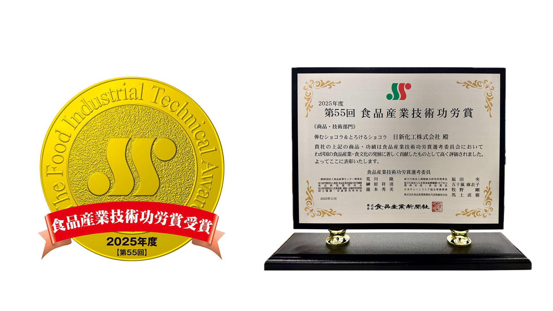 日新化工株式会社(本社:東京都中央区、代表取締役社長:直井広明、以下「日新化工」)が開発した本格チョコレート粉末「弾むショコラ」「とろけるショコラ」が、食品産業新聞社の技術功労賞(商品・技術部門)を受賞いたしました。
