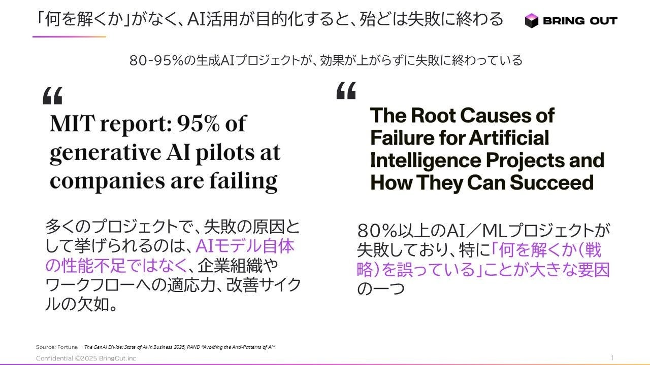 背景には、AIという手段が目的化し、「どのツールを使うか」「どんなモデルを導入するか」といった議論が先行し、そもそも"何を目的にAIを使うのか"という経営論点が定義されていない根本的な問題があります。