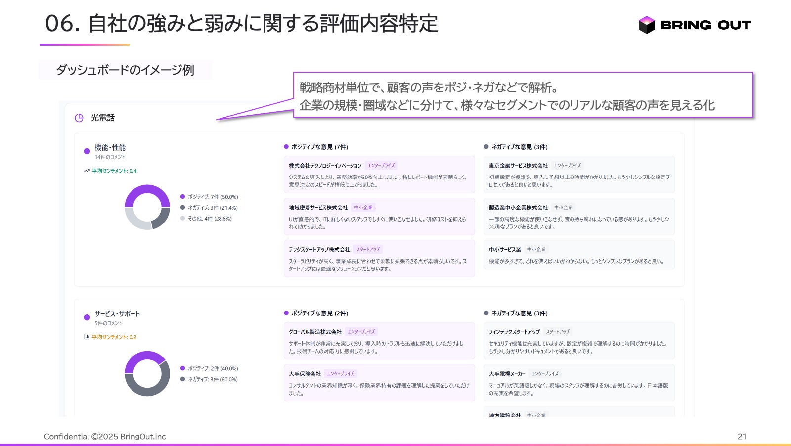 分析結果をもとに、要約・洞察・提言などを自動生成。組織が無理なくエージェントを使い続けることで、「経営変革を常在化」させます。