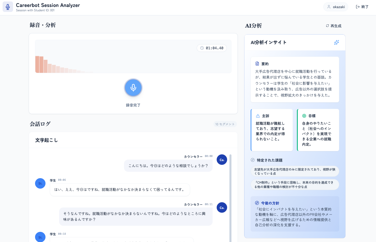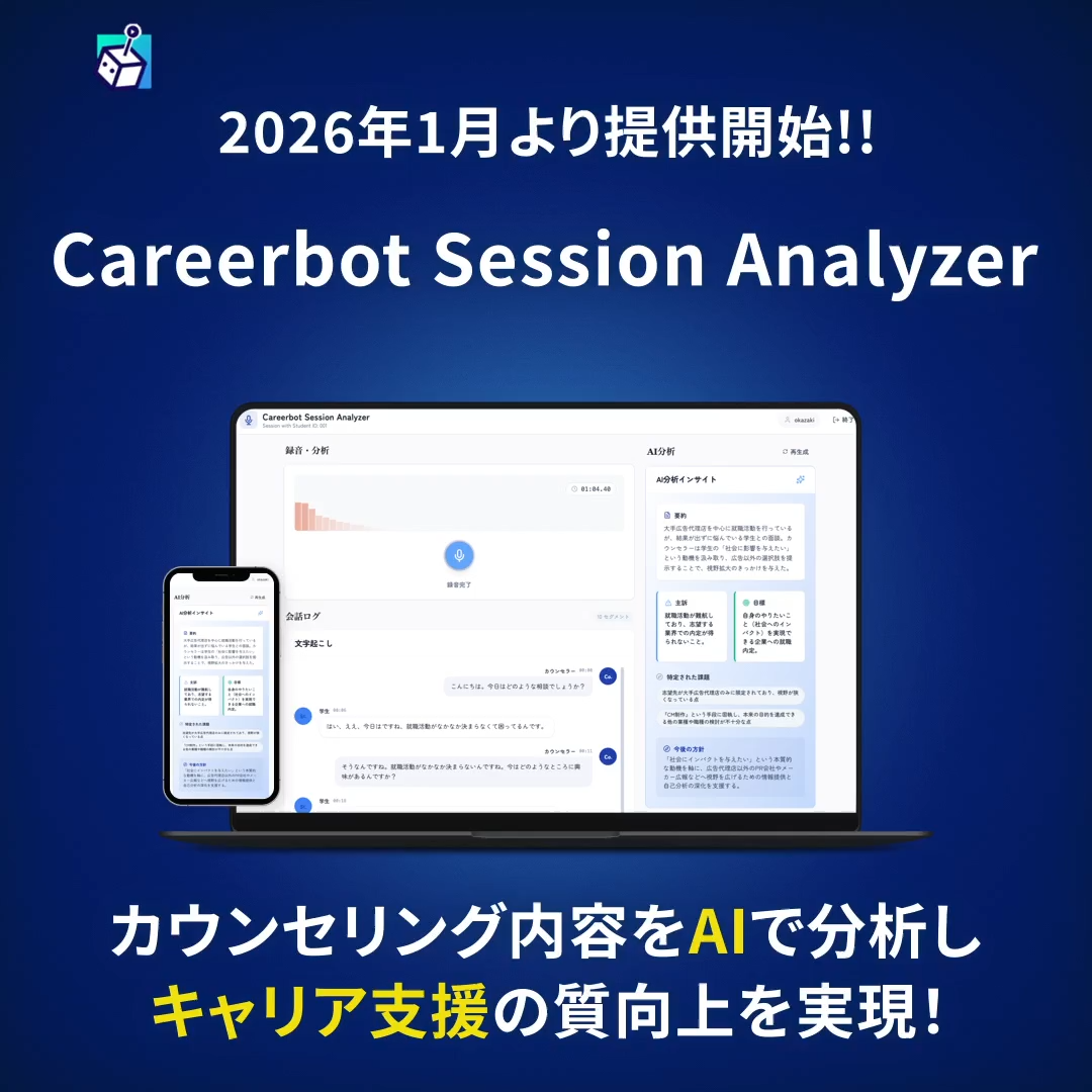 株式会社キャリアボット(本社:東京都世田谷区、代表取締役:岡崎浩二)は、大学キャリアセンター向けに、AIによるキャリアカウンセリング分析サービス「Careerbot Session Analyzer」の提供を開始しました。本サービスは、キャリアカウンセリングの内容をAIで分析し、支援の質向上と効率化を実現するものです。