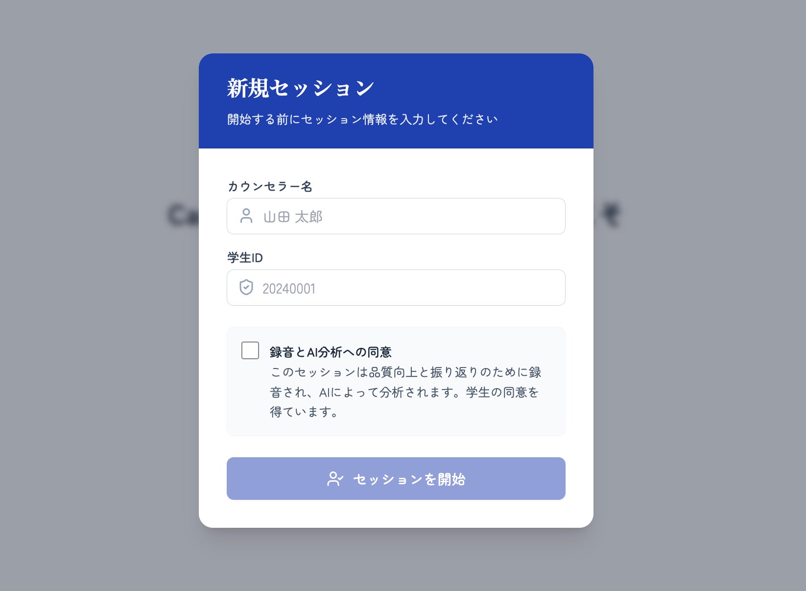 セッション開始前に、相談内容の録音およびAI分析について、学生本人の同意を取得します。