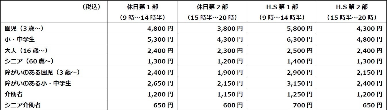 一般料金(税込):2022年8月29日(月)以降の休日(土曜・日曜・祝日)およびH.S