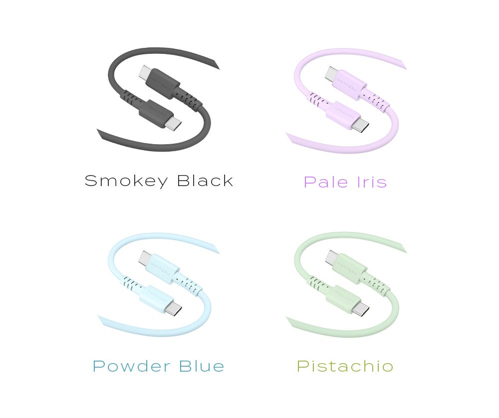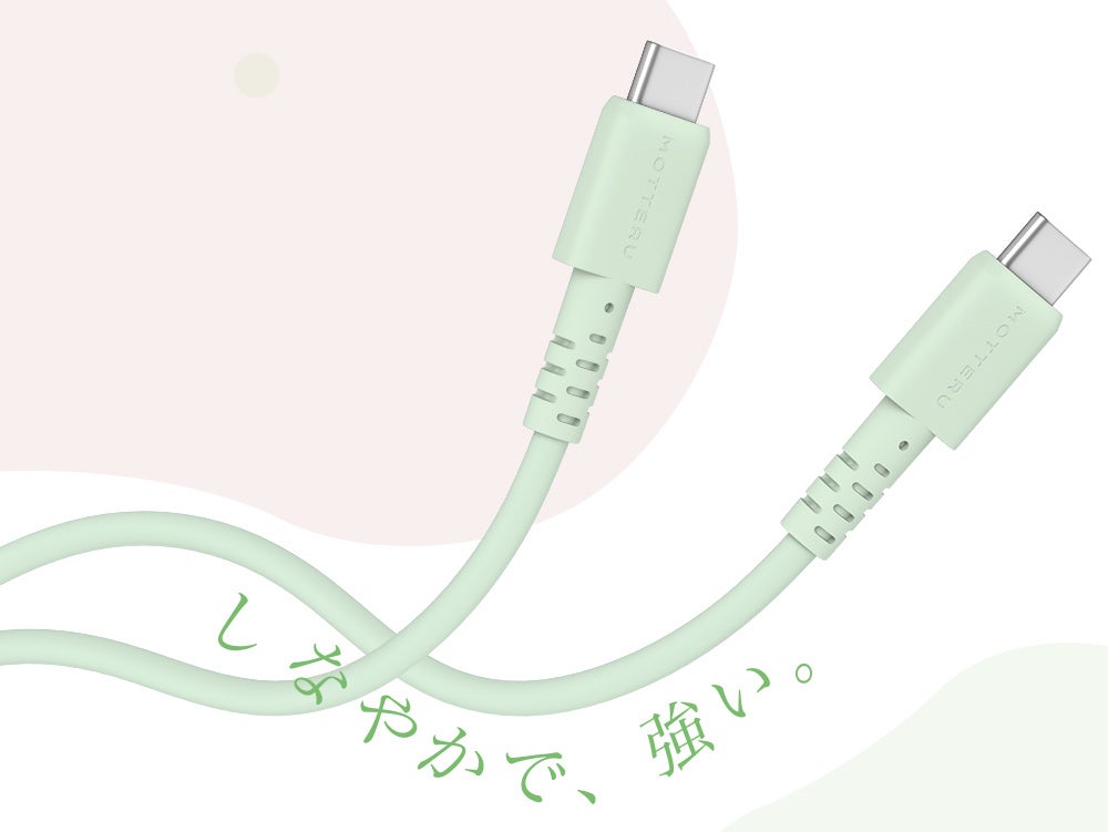 MOTTERUのシリコンケーブルは、まるで赤ちゃんの肌のようになめらかで、ずっと触っていたくなるような手触りです。MOTTERUらしい優しいカラーリングと、可愛らしく、自分の好みで楽しむことができることから、人気の商品です。可愛らしいカラーリングながらも、しなやかで断線に強く、50,000回の屈曲試験をクリアした耐久性も備えています。今回はその人気のケーブルにUSB2.0のPD60W対応でデータ通信ケーブルとしても使用できる「USB-C to USB-C」が仲間入り。また昨年末に発売した「USB-A to Lightning」「USB-A to USB-C」「USB-C to Lightning」にピスタチオの新色が追加され、さらに充実しました。