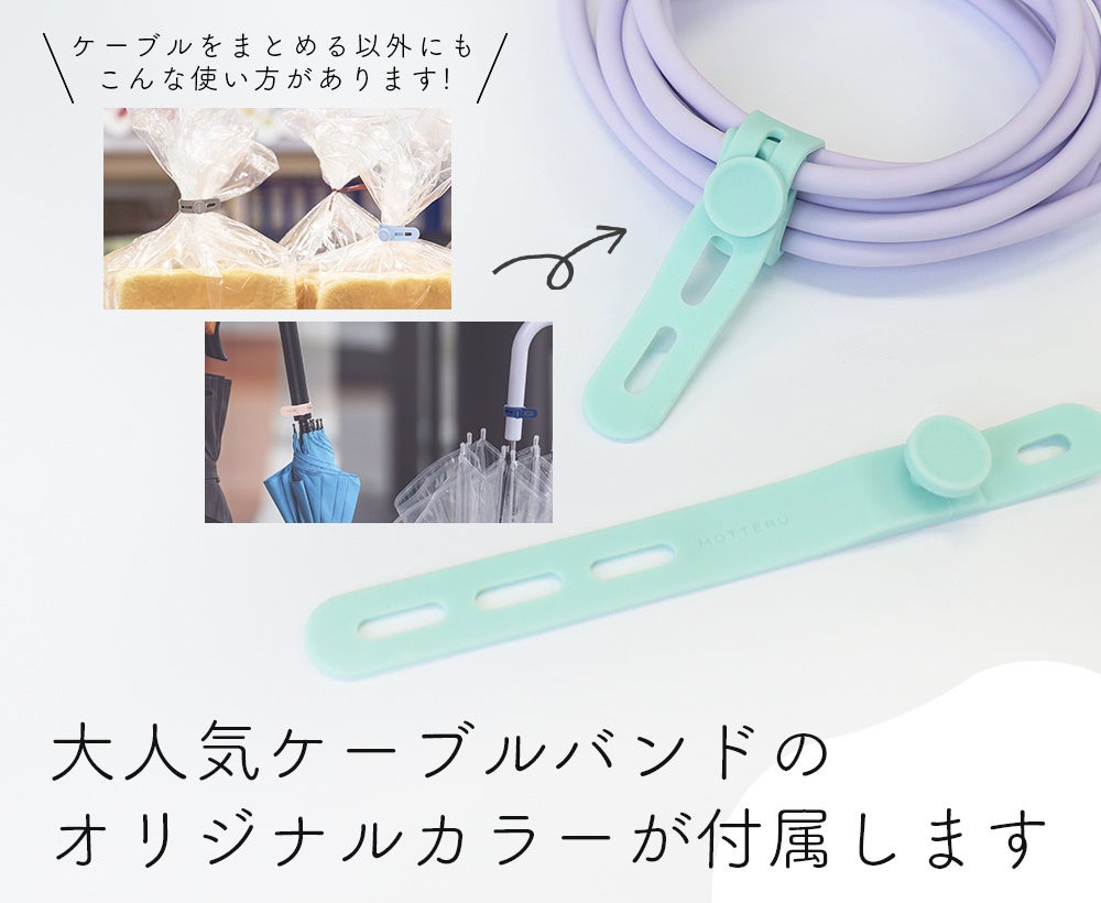 やわらかいのでまとめやすく、持ち運ぶ時も便利です。従来のケーブルはマジックテープタイプのケーブルバンドを付属していましたが、ホコリや細かいゴミがついてしまうというご指摘もありま した。今回、MOTTERUで人気の、シリコン製のケーブルバンドもついているので、マジックテープと比較して、ホコリやゴミが付着しにくくなりました。