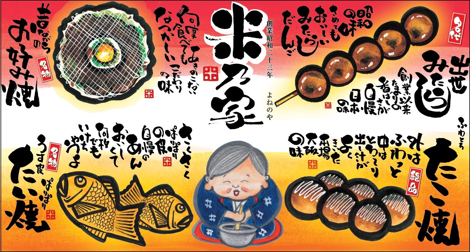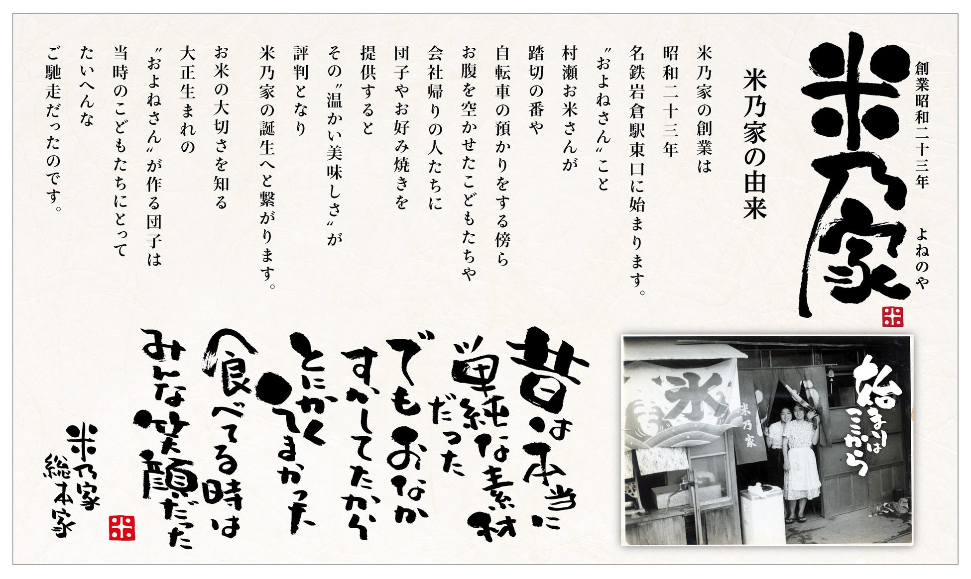 ⽶乃家の創業は昭和23年、名鉄岩倉駅東⼝に始まります。“およねさん”こと村瀬お⽶が踏切の番や⾃転⾞の預かりをする傍ら、お腹を空かせた⼦供たちや会社帰りの⼈たちに団⼦やお好み焼きを提供すると、その“温かい美味しさ”が評判となり⽶乃家の誕⽣へとつながりました。