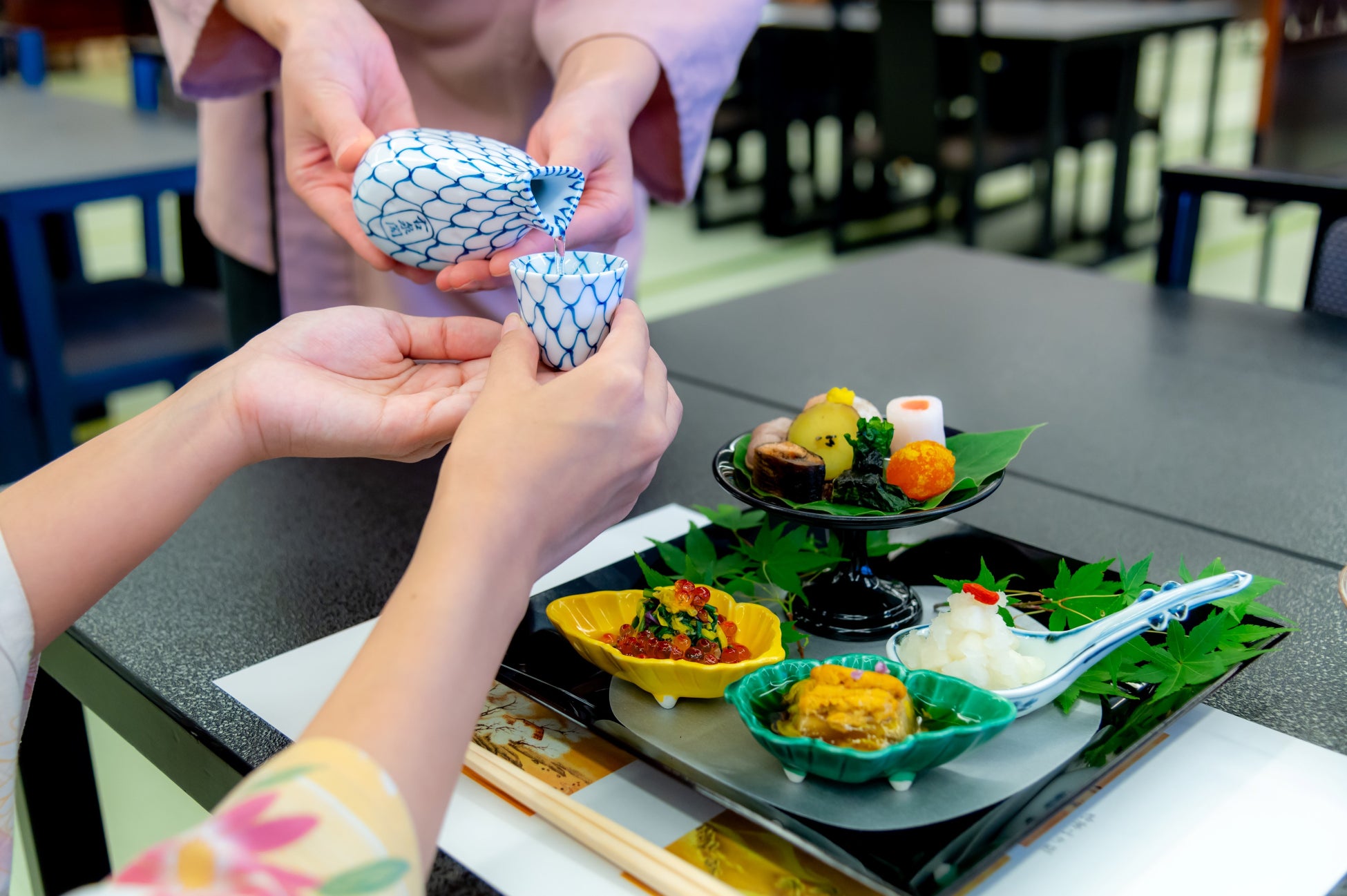 古泉閣では、旬の食材が器を彩る古泉閣自慢の「懐石料理」を提供しております。その中、「懐石料理」と「日本酒」の相性が良く、お客様より多くのご要望を頂戴しております。古泉閣には、日本酒ナビゲーターの資格を持つ従業員が複数人在籍しており、懐石料理に合う地酒を厳選してご用意しています。ラインナップには、入手困難な日本酒や兵庫県内の蔵元、山田錦で醸した純米酒などもあり、またそれらを季節ごとに入れ替え、お楽しみいただいております。