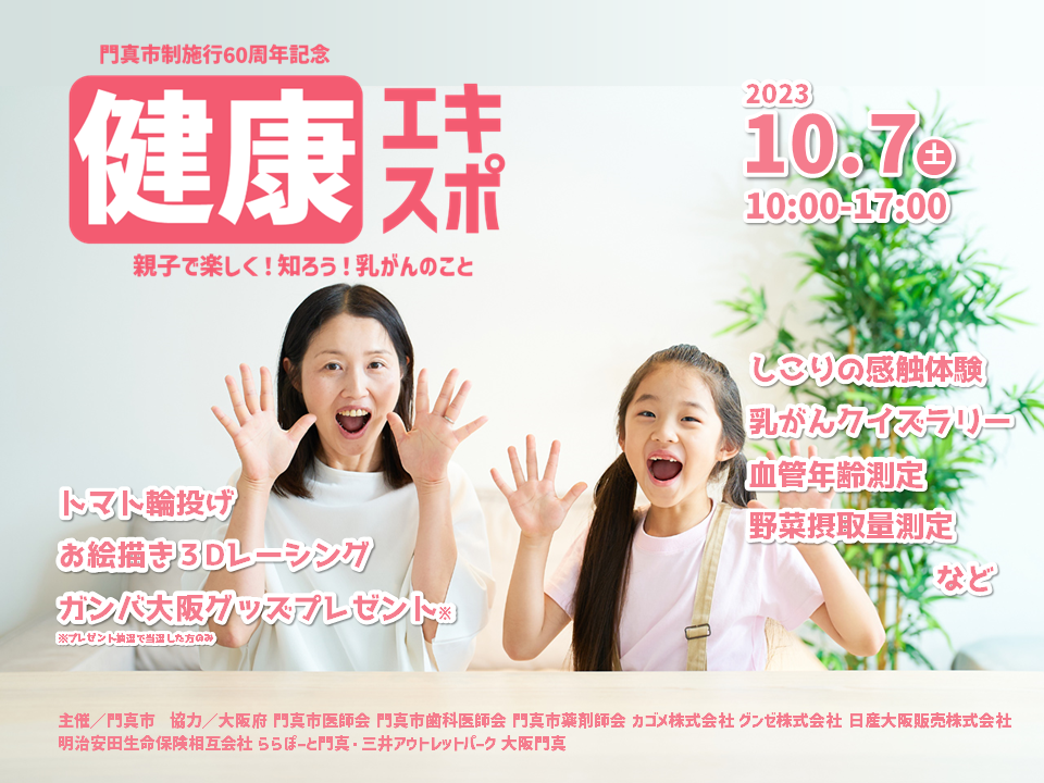 市の課題である健康意識の向上及びがん検診の受診率向上をめざすとともに、大阪・関西万博の機運醸成を図るため、門真市では民間企業等と連携したイベント「門真市制施行60周年記念「健康エキスポ」- 親子で楽しく!知ろう!乳がんのこと -」を開催します。