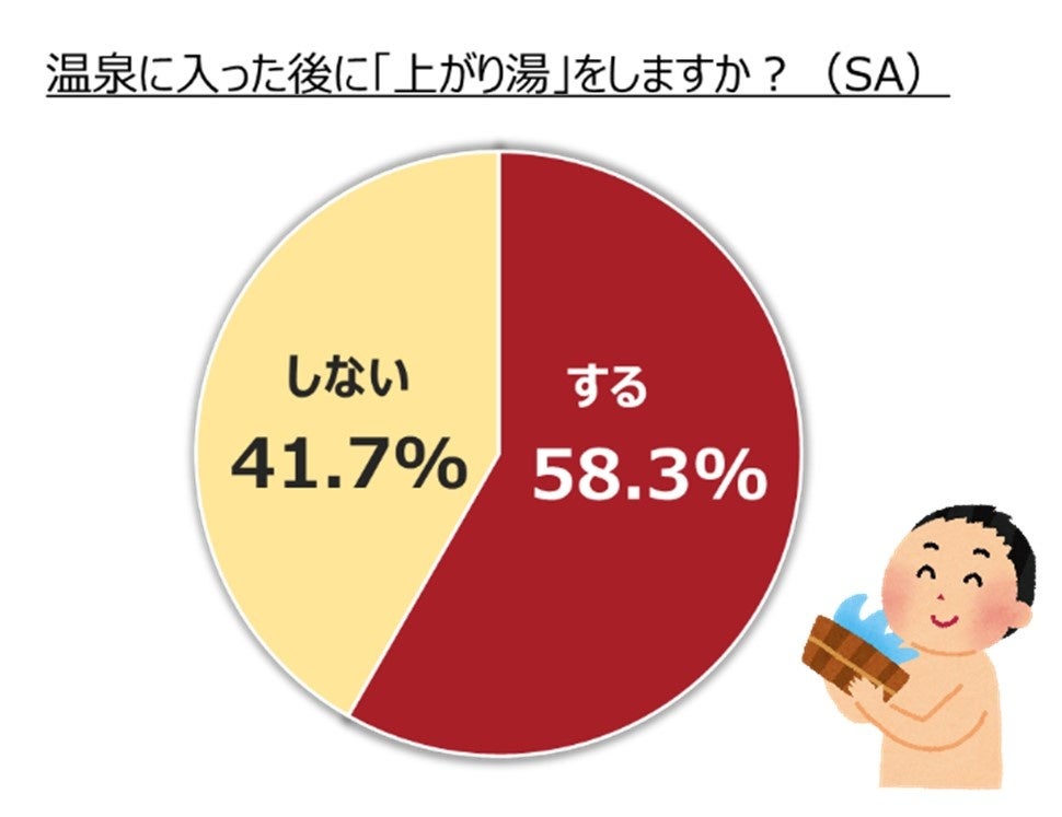 「温泉に入った後に上がり湯をしますか?」という質問に対しては、上がり湯を「する」と回答した方が58.3%、「しない」と回答した方が41.7% という結果となりました。「する」派からは、「菌や汚れが気になる(30代女性)」「温泉成分を体に残したくない(60代女性)」 と、肌を最後にリセットしたいという声がある一方、「しない」派からは「必要性を感じない(20代男性)」「温泉成分を残しておきたい(40代女性)」「習慣にない(50代男性)」という声があがりました。