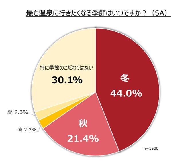 夏の暑さが落ち着き、涼しい季節に移り変わると温泉に行きたくなる方も多いのではないでしょうか。「最も温泉に行きたくなる季節はいつですか?」という質問に対して、「冬」が44.0%、「秋」が21.4%、「春」「夏」がそれぞれ2.3%という結果が出ました。また、「特に季節のこだわりはない」と回答した方も30.1%にのぼりました。