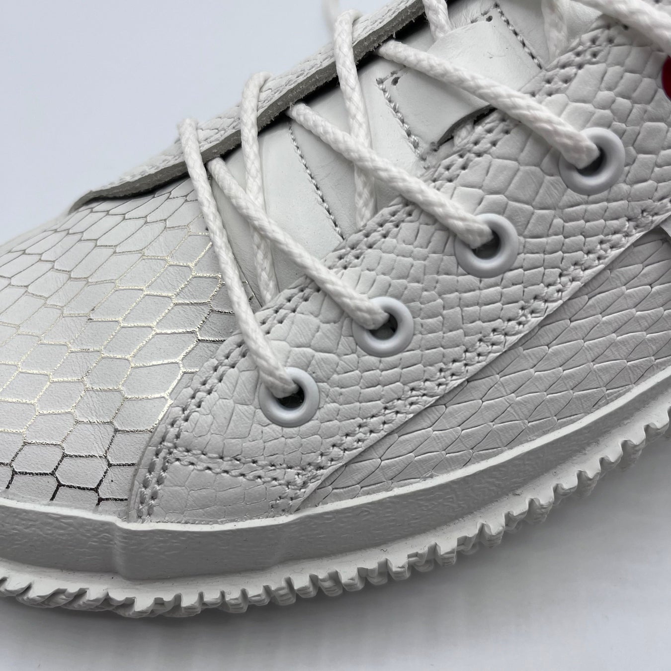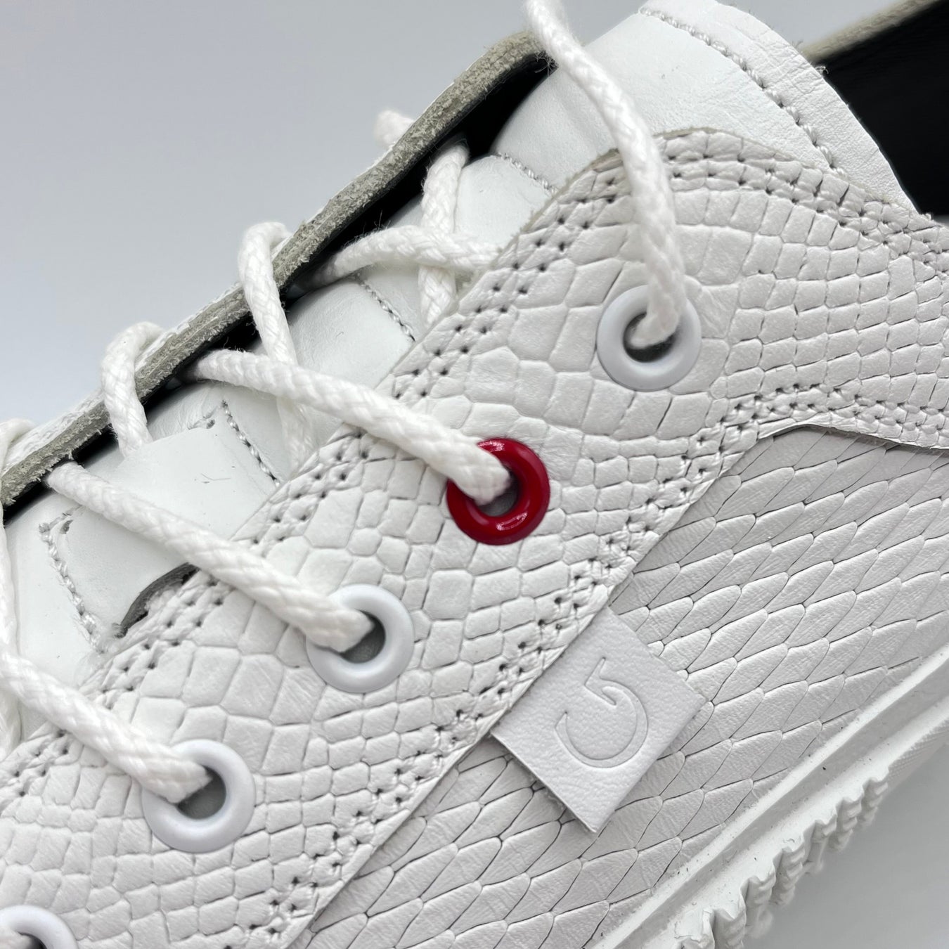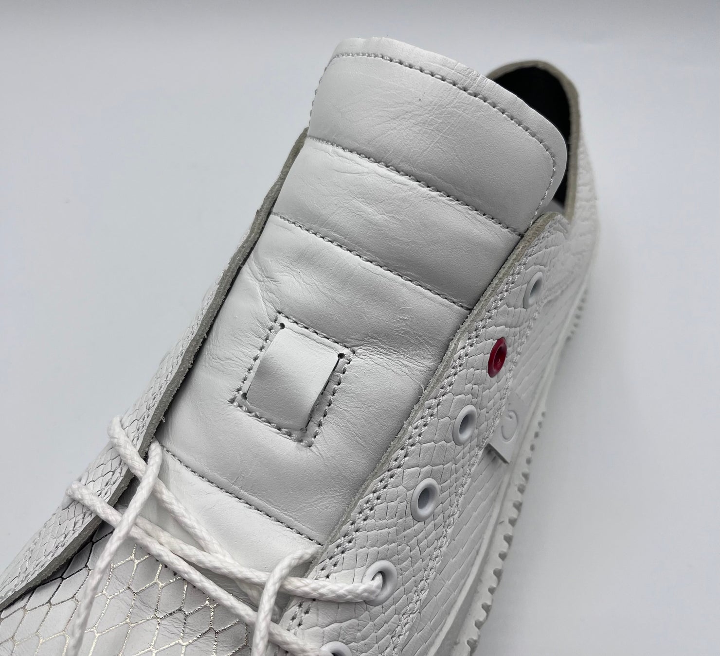 今回の干支モデル「SP-1038」は、靴表面に3種類の鱗柄の型押しレザーを採用することで「白蛇」のリアルな質感を再現しています。さらにシュータンは内側にクッションを挟み込み、ステッチを入れることで蛇腹を立体的に表現するとともに、足あたりの良さも実現しています。ハトメの一部を赤くすることで「白蛇」の眼を、靴紐に白い丸紐をセットすることで白蛇自体をイメージさせ、白に統一されたインソールのブランドロゴは新年を祝う金色にと、細部にまで縁起の良い「白蛇」のディティールとなっています。