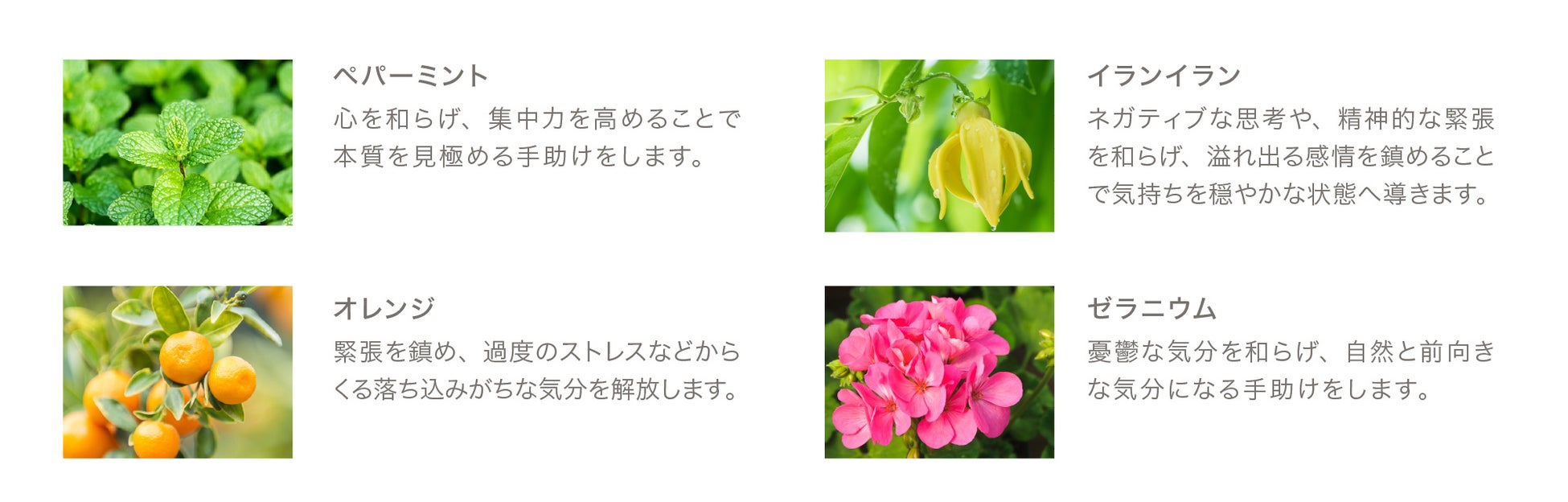 「センシュアリティー」をキーワードとしてデザインされたラグジュアリーな香りは、女性らしい感性を高めるイランイラン、自信を底上げするゼラニウム、ポジティブなムードをもたらすオレンジ、そして思考のリフレッシュに効果的なペパーミントが織りなす独創的なレイヤード。まるでヒーリングの旅に出ているかのように穏やかに移ろいながら、セルフラブへの道のりをガイドします。