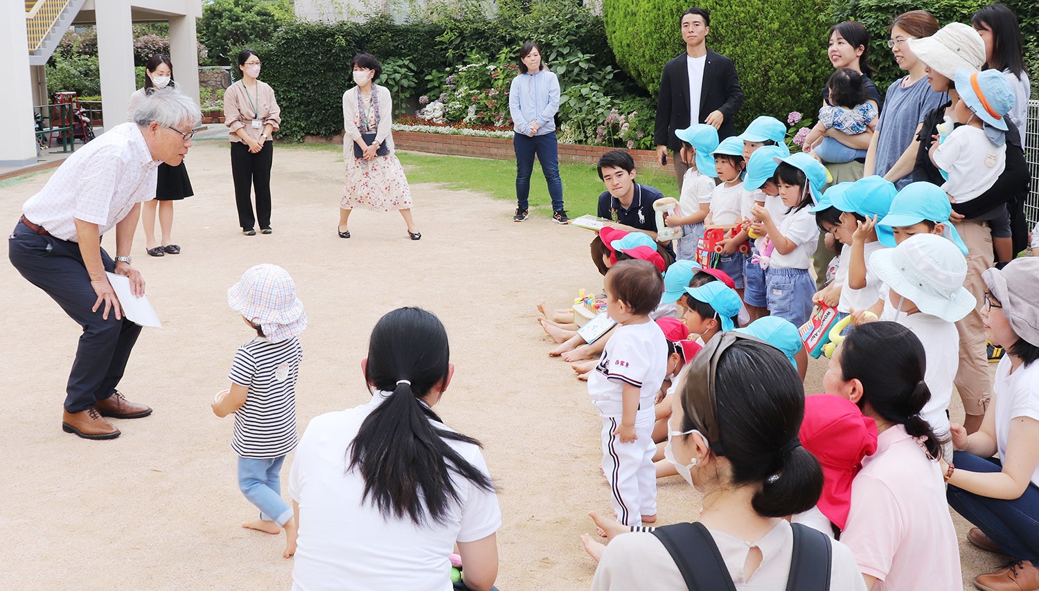 おもちゃの寄贈式には小槌幼稚園の園児たちの他、近隣の未就園のお子様など多くの方にお集まりいただき、また、芦屋市長の髙島崚輔様、芦屋市教育長の福岡憲助様にもご臨席いただきました。