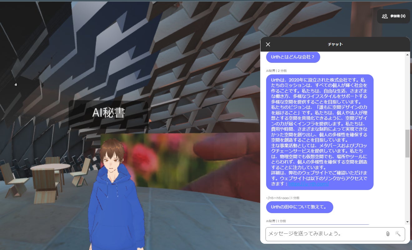 その中で、チャットの中で、AIやシナリオボットとの会話をすることで、案内する人がいなくとも空間を楽しめる仕様が求められています。