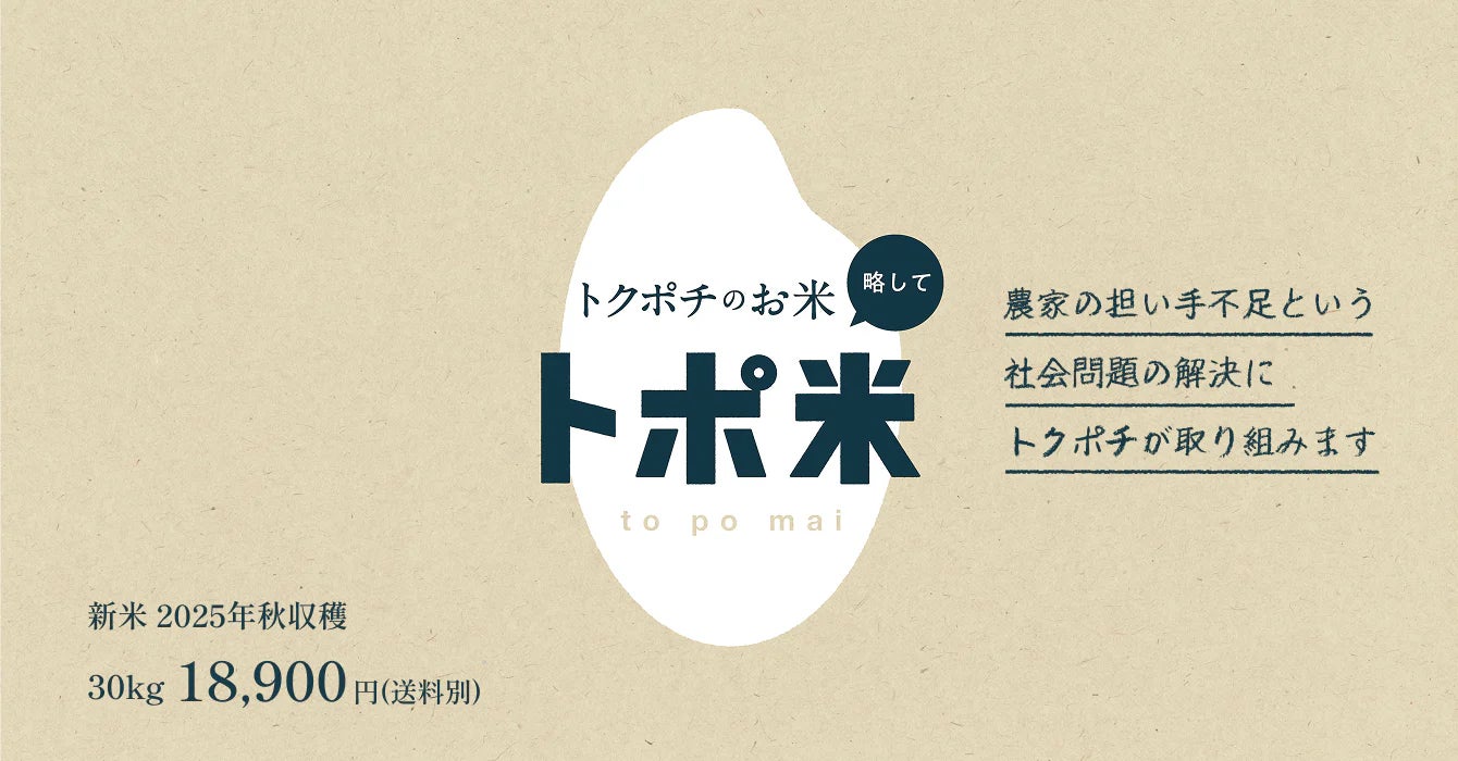 フードロス削減サービス「トクポチ」を運営する株式会社STRKは、2025年10月、新サービス『トポ米』を開始いたします。本サービスは、農家から高く買い取り、消費者には安く販売することで、日本の米農家が抱える収益性・担い手不足の課題を解決することを目指します。第一弾として滋賀県産近江米「キヌヒカリ(玄米)」30kgをテスト販売いたします。
