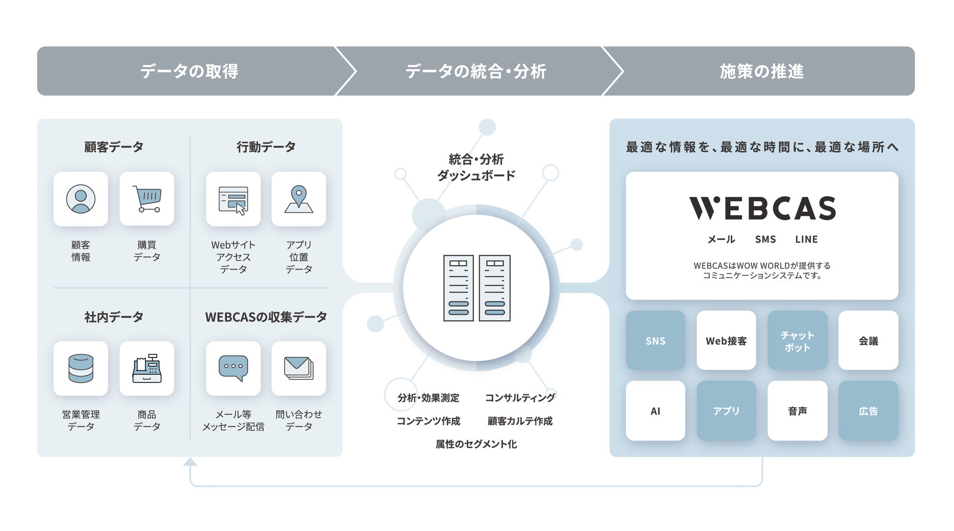 WOW WORLDは、メール配信やフォーム作成を軸としたコミュニケーションシステム「WEBCAS」やCDPソリューション「WOW engage」の企画開発・販売を通して、企業のマーケティング活動とカスタマーサクセスにおける課題解決を支援しています。