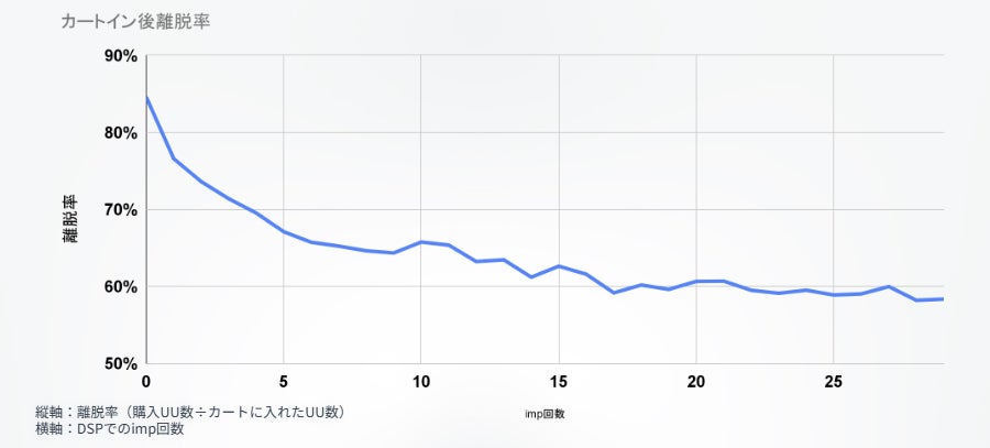さらに離脱率と広告インプレッション数の相関を見てみました。離脱率は広告インプレッション数によって下がる傾向にありました。もともとは85%程度ある離脱率が、広告(Amazon DSP)に接触することで、35%ほど離脱率を改善できる可能性が高いです。