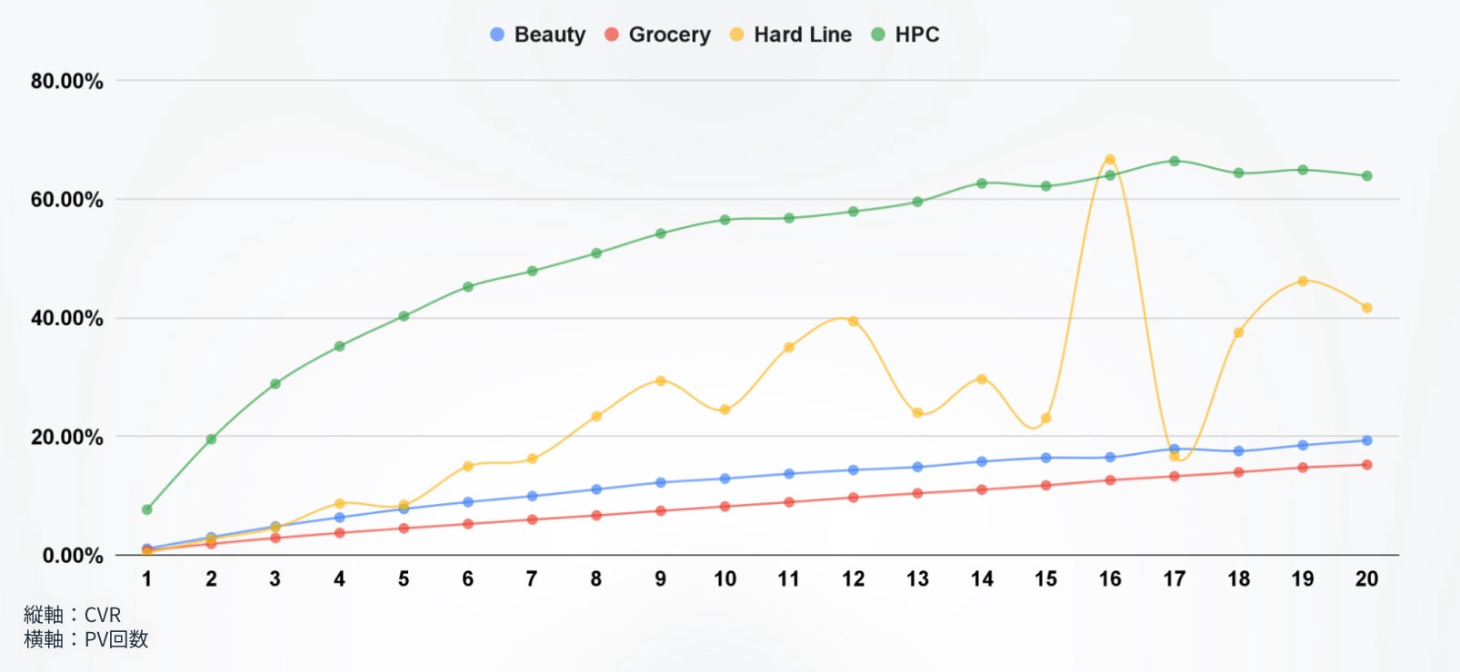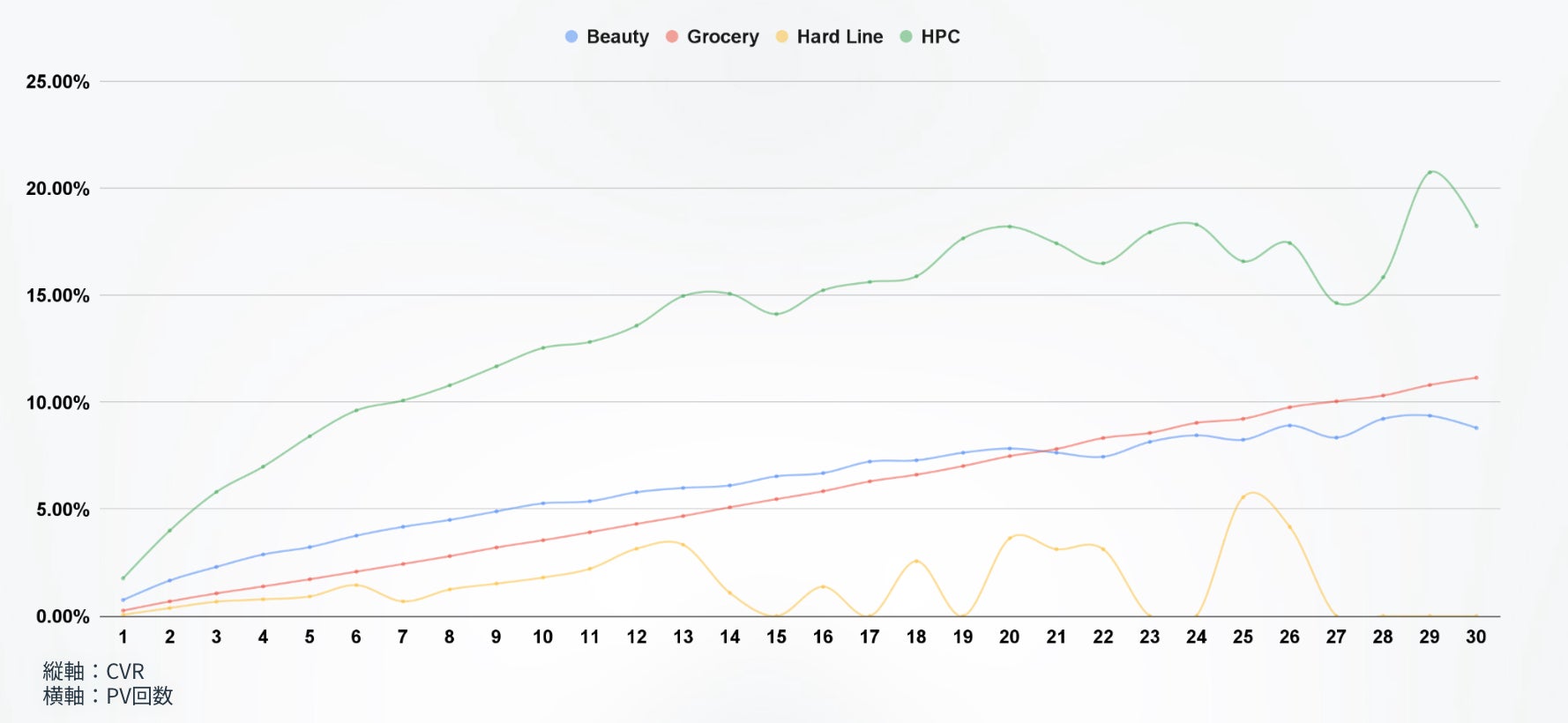 同様に、ブラックフライデー期間中での閲覧数とCVRの関係を可視化しました。HPCは14回付近まで閲覧数に応じてCVRが上昇し、Beauty・Groceryでは微増ながら直線的に推移している結果となりました。Hard Lineでも1ユーザーあたりの閲覧数とCVRは10回付近までは相関することがわかりました。