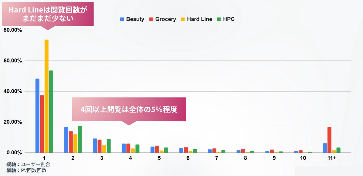 上図は閲覧数別のユーザー数を可視化したものになります。全体の約50%程度は閲覧数1回とまだまだ引き上げる余地があると言えます。特にHard Lineについては、1回閲覧のユーザーが70%弱と非常に多いことが上図を見てわかります。また先述のCVR5倍となる目安4回についても全体の5%しかいないため、まだ売上拡大の可能性が高いと考えられます。