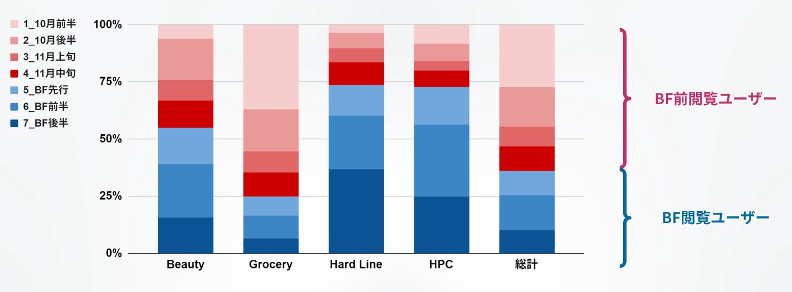 また、Grocery(食品・飲料・お酒等)では、他ジャンルと異なり、ブラックフライデー前に閲覧をした上で、ブラックフライデー期間で購入するユーザーが目立ちました。