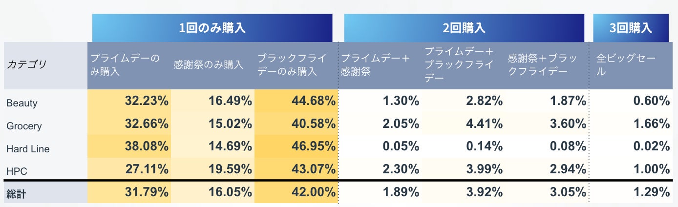 さらに、セールごとかつカテゴリごとの購入回数を調査しました。ブラックフライデーでのみ購入するユーザーが最も多く、ブラックフライデーの非参加は大きな機会損失につながることが言えます。