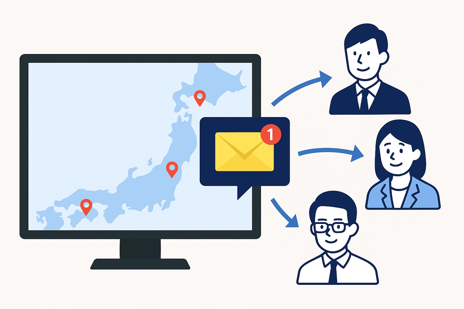 災害発生後、発表エリア内の拠点をリアルタイムで抽出し、マップ上に可視化します。一目で影響範囲を把握することで、次なる対応判断への早期着手が可能となります。