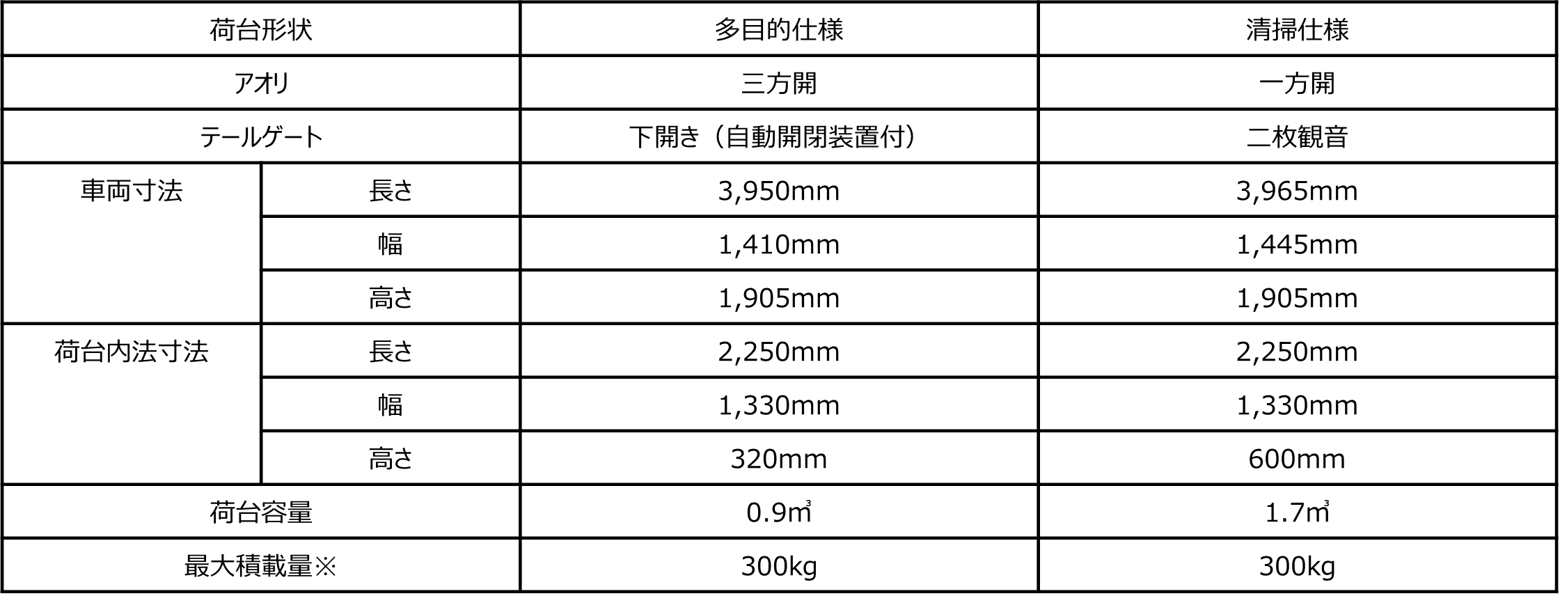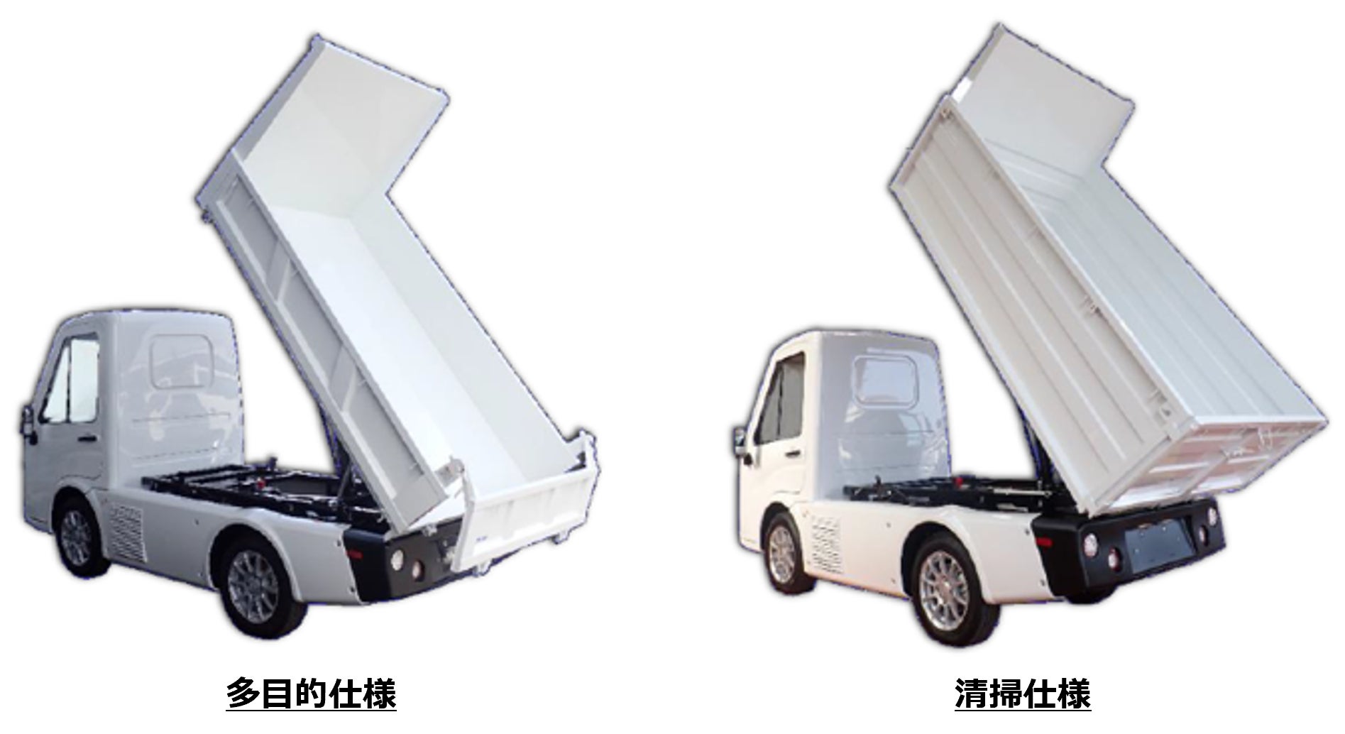 荷物の積載がしやすくダンプ時にテールゲートを自動開閉できる多目的仕様、体積の大きな荷物を積みやすい清掃仕様、これら用途に応じて選べる2つのタイプの荷台形状を設定しました。