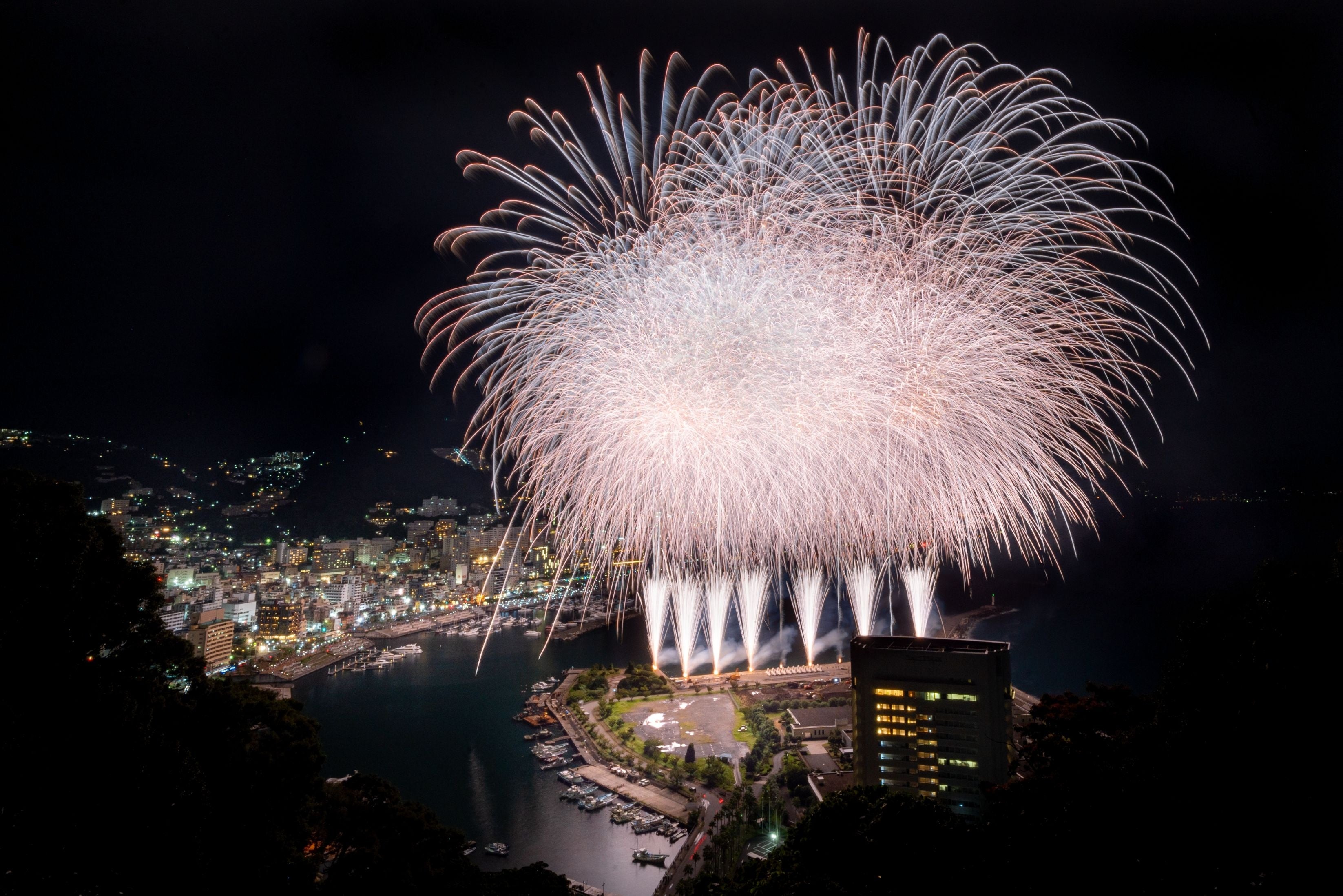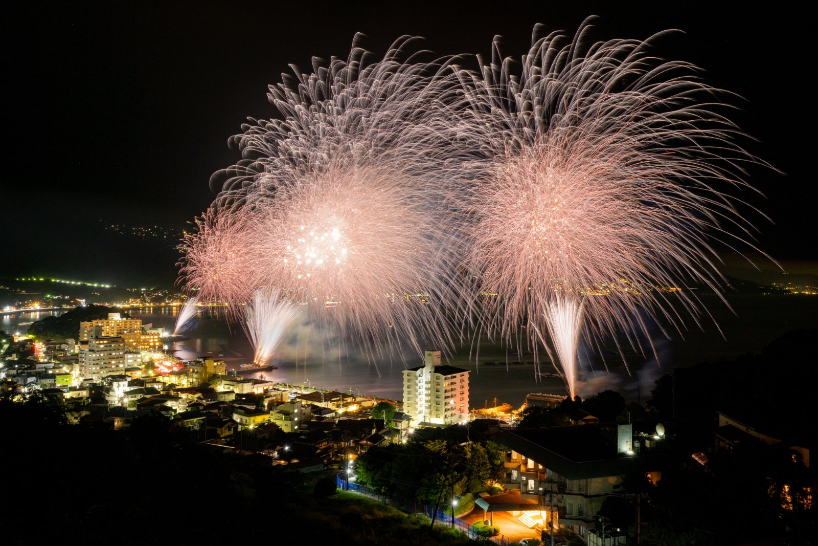 熱海の花火の大きな特徴は2つ。一つはフィナーレ「大空中ナイアガラ」、もう一つは「打上げ会場」です。