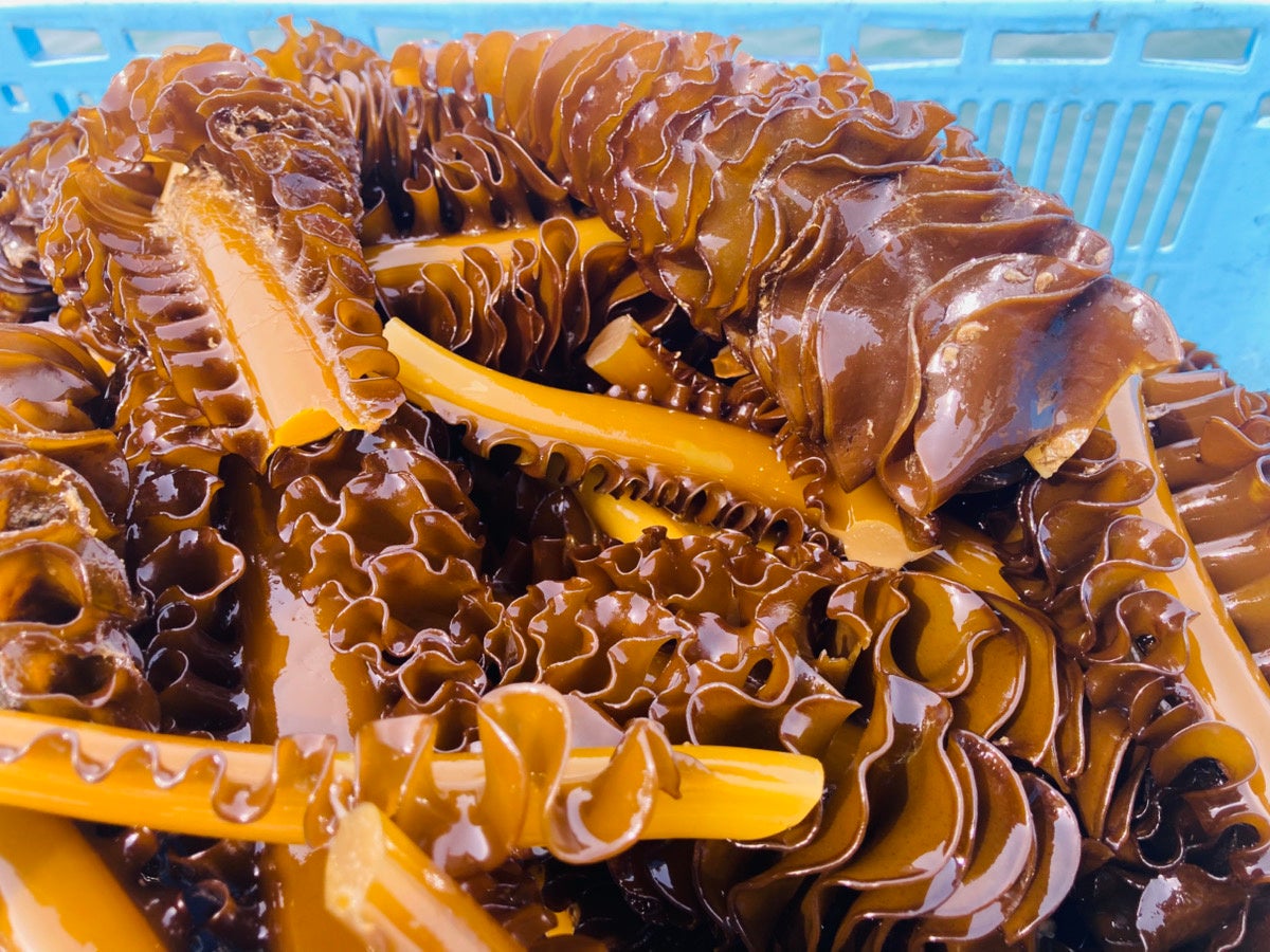 メカブとはワカメの茎の付け根にある新芽部分であり、アルギン酸、ビタミンK、カルシウム、鉄分など多くの栄養素を含んでおり、「海のスーパーフード」とも言われています。また、当社の商品主原料である「フコイダン」がワカメ葉状部分よりも豊富に含まれていることから非常に強いヌメリがあり、健康と美容に適した原料素材となっています。