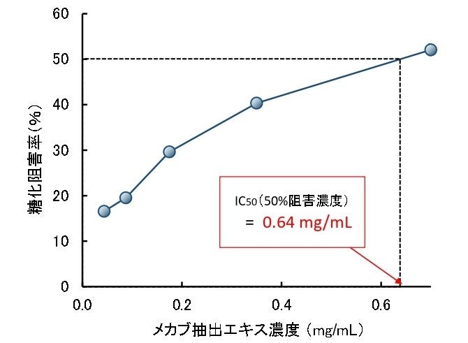 「KAISO」イノベーション企業である株式会社ヴェントゥーノ(福岡市中央区、代表取締役社長:中野勇人)は、「メカブ抽出エキス」の添加による抗糖化(※1)活性について検証しました。その結果、「メカブ抽出エキス」には、高い抗糖化活性が認められ、IC50値(※2)が0.64 mg/mLであることが示されました。